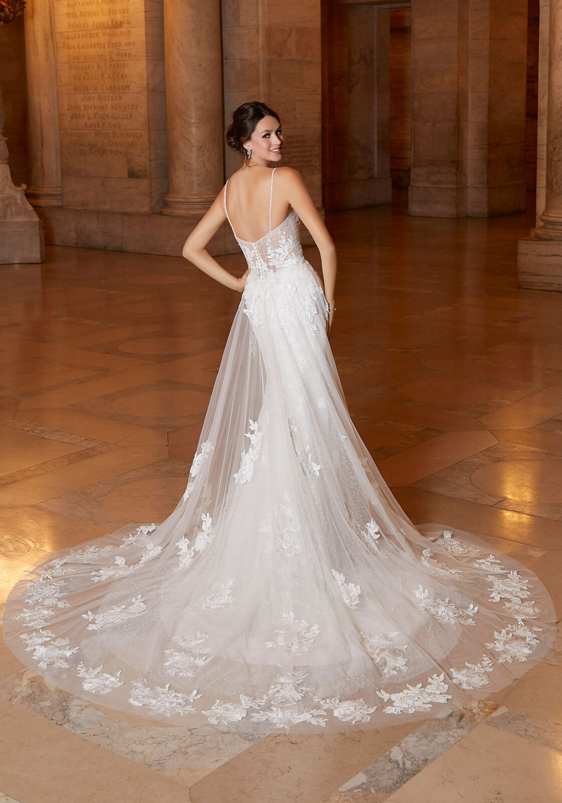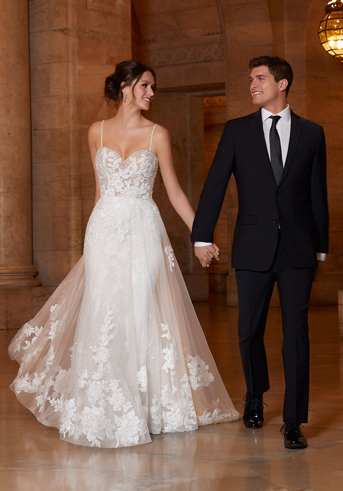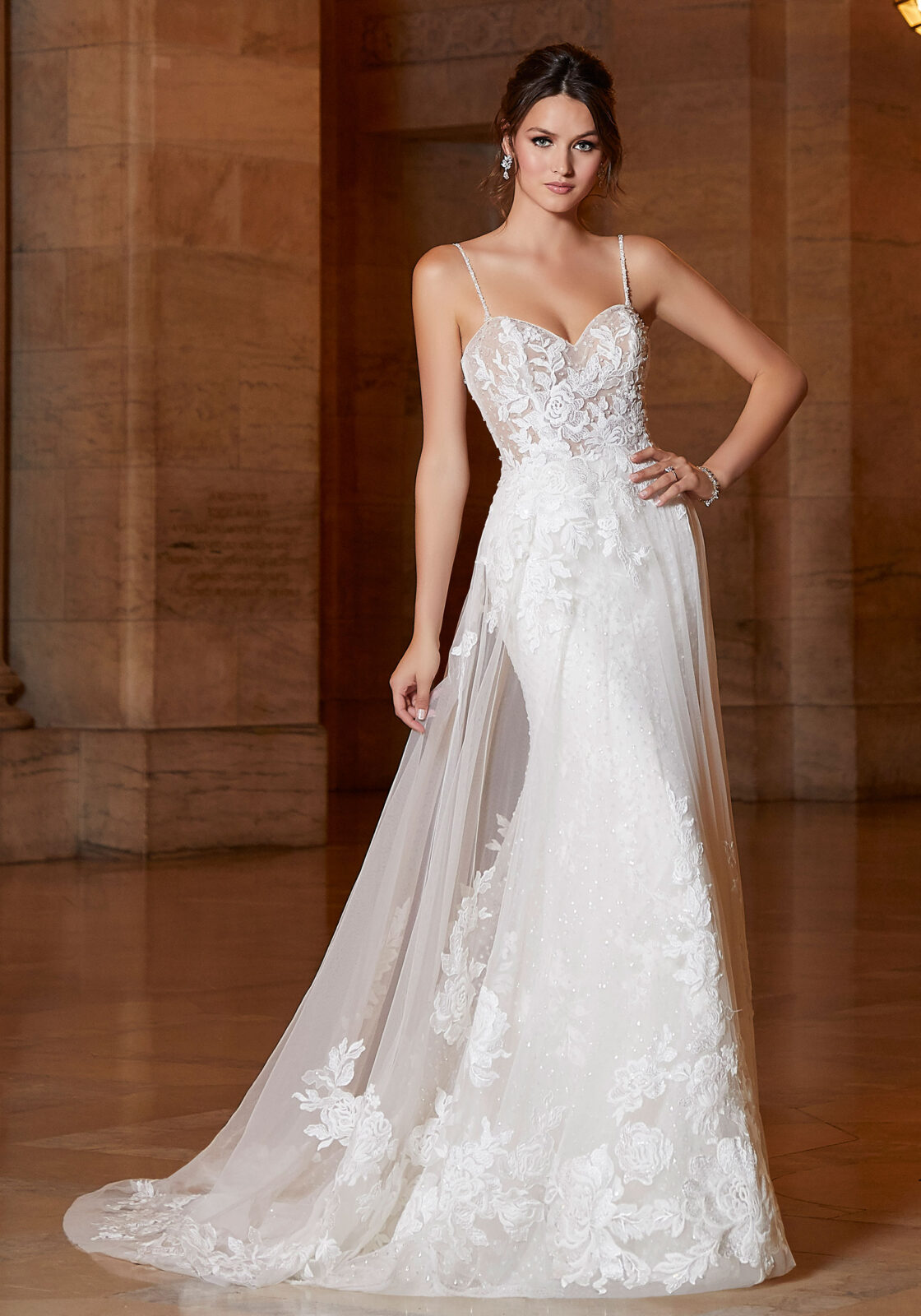 Frosted, floral embroidered appliqués beautifully accent the romantic sweetheart neckline on the Amabelle designer wedding dress. Delicately beaded straps add the perfect touch of sparkle. A full tulle overskirt adds movement to the tulle fit and flare underlayers accented in sequin and appliqués. Lace hemline edging and a long, sheer train complete the dreamy look