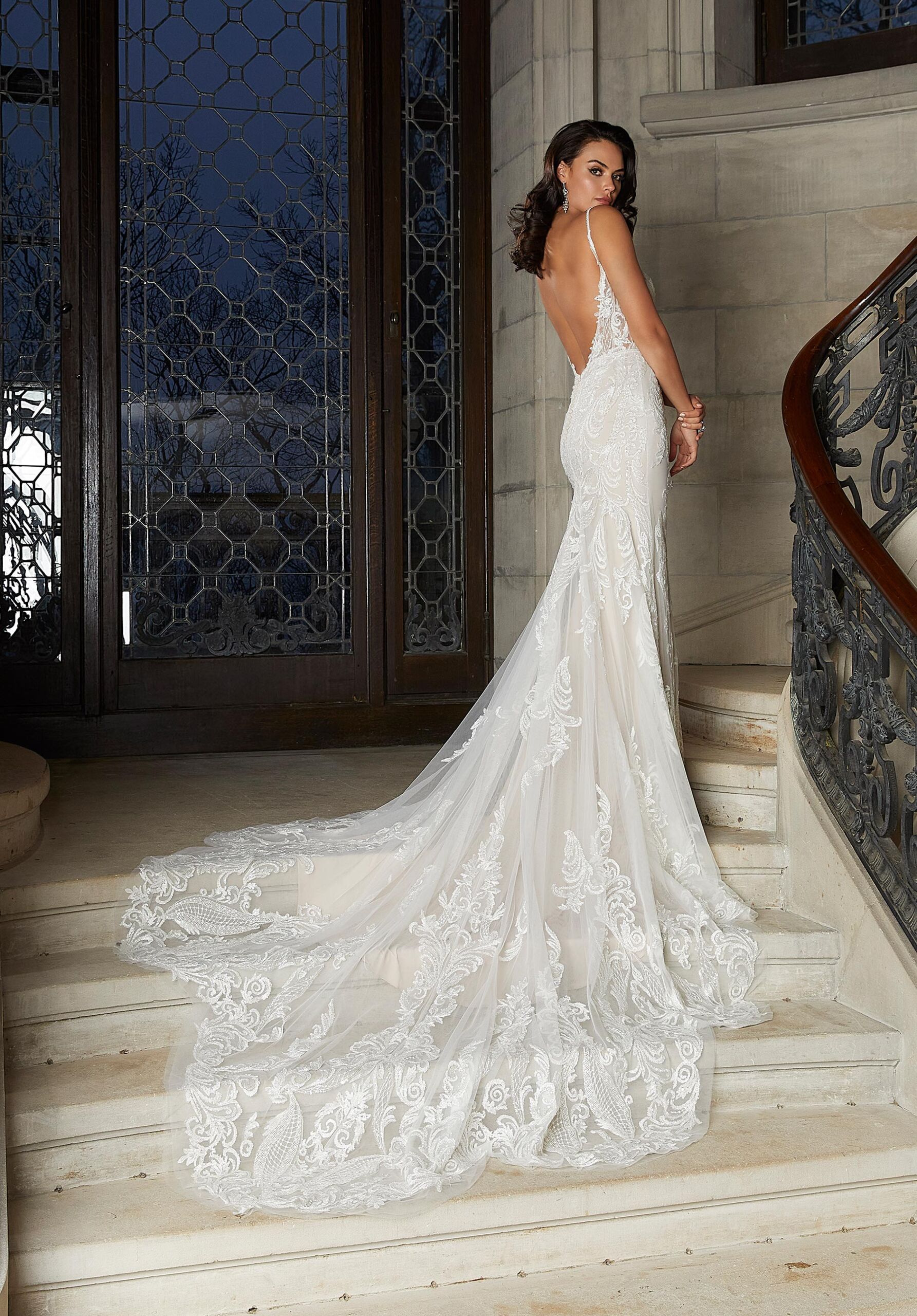 The Chanterelle designer wedding dress is a dimensional dynamite. The chic fit and flare features ornate, frosted, medallion style embroidery and glistening crystal beaded waistband to emphasize the silhouette. The v-neckline has a sheer, plunging inset, as well as sheer side panels, and a daring low back, while a sheer petal train adds a lovely feminine touch.