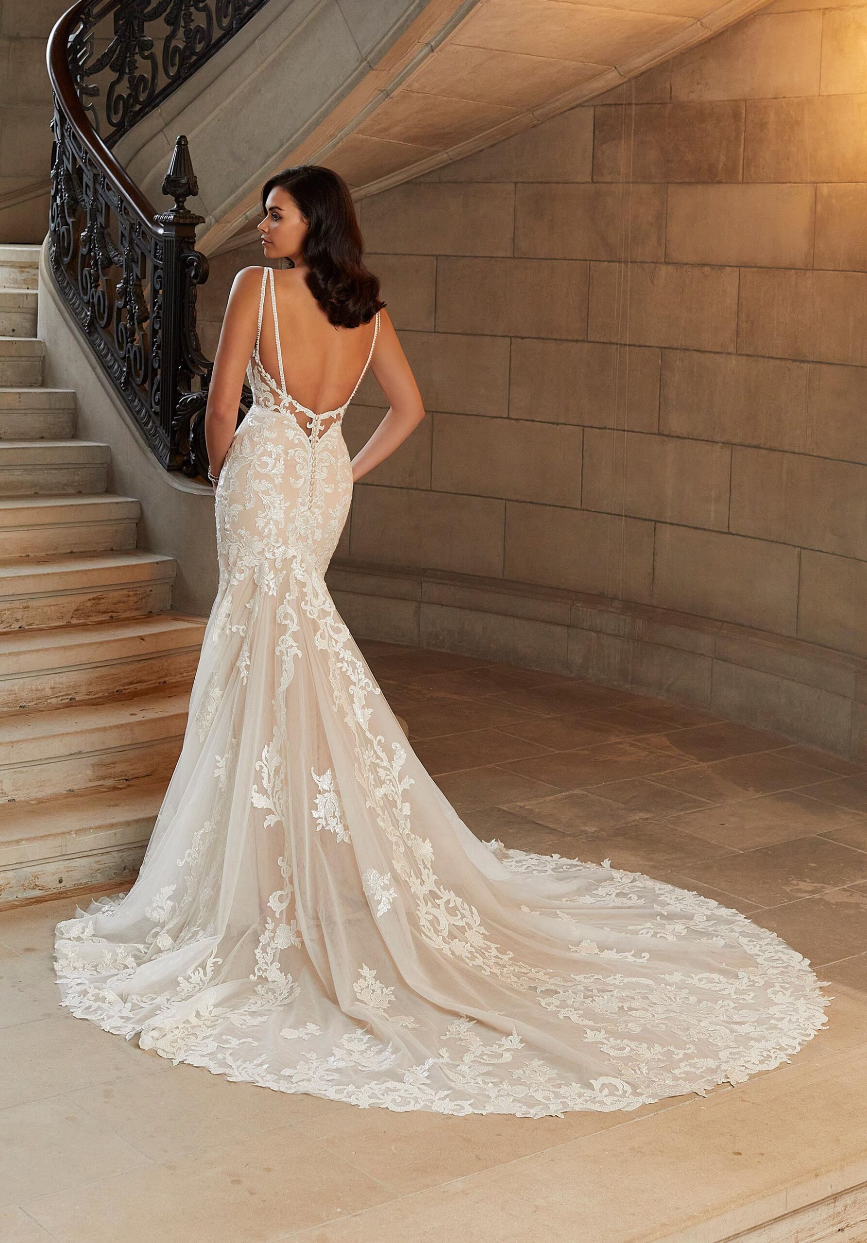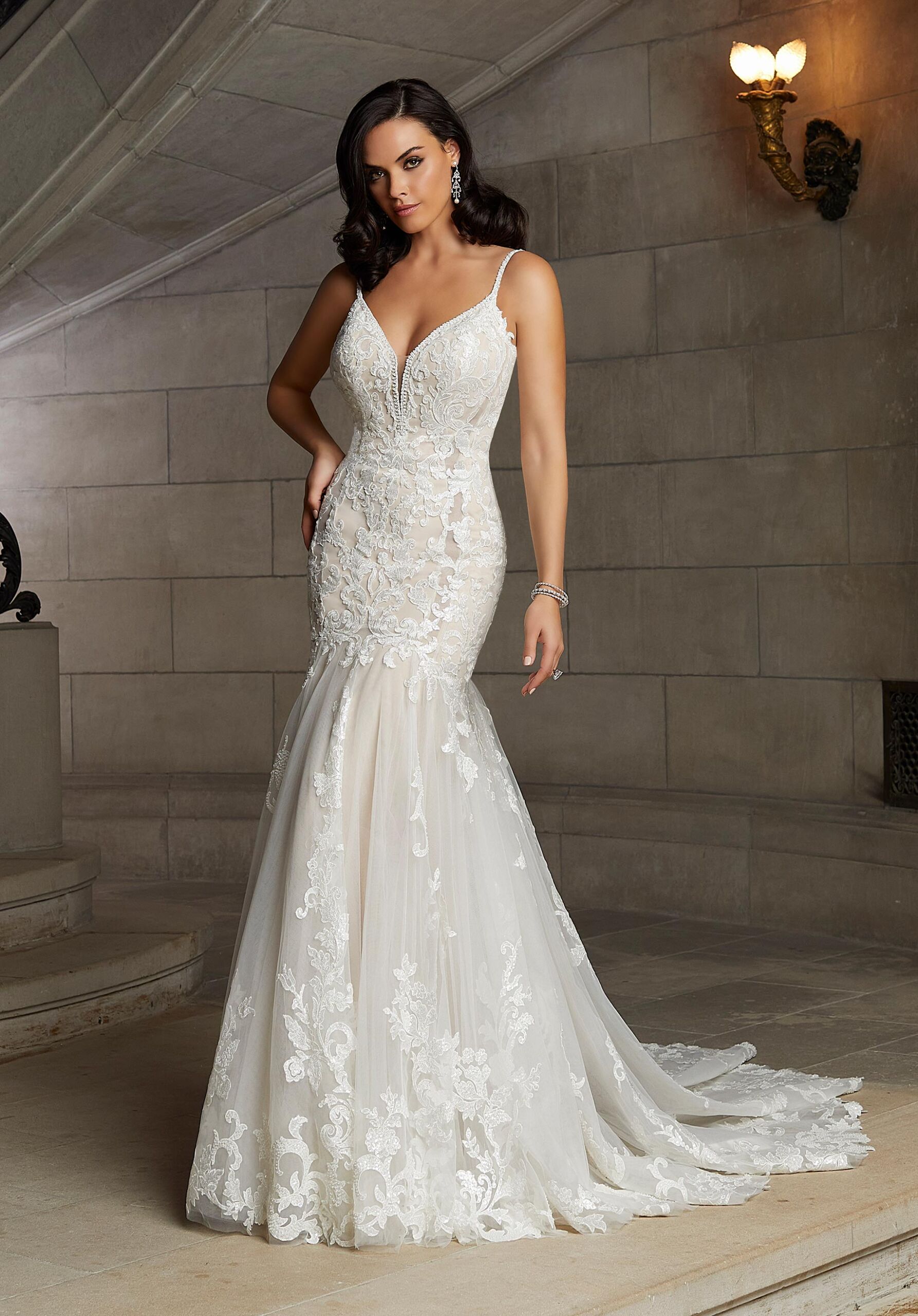 No one can mess with the Claudette designer wedding dress. Full of high-class style and couture details, the tulle mermaid features delicate, frosted embroidered appliqués with crystal beaded straps, and neckline trim, for some subtle sparkle. The sheer train, with a wide, scalloped hemline, is the perfect finishing touch for your dramatic