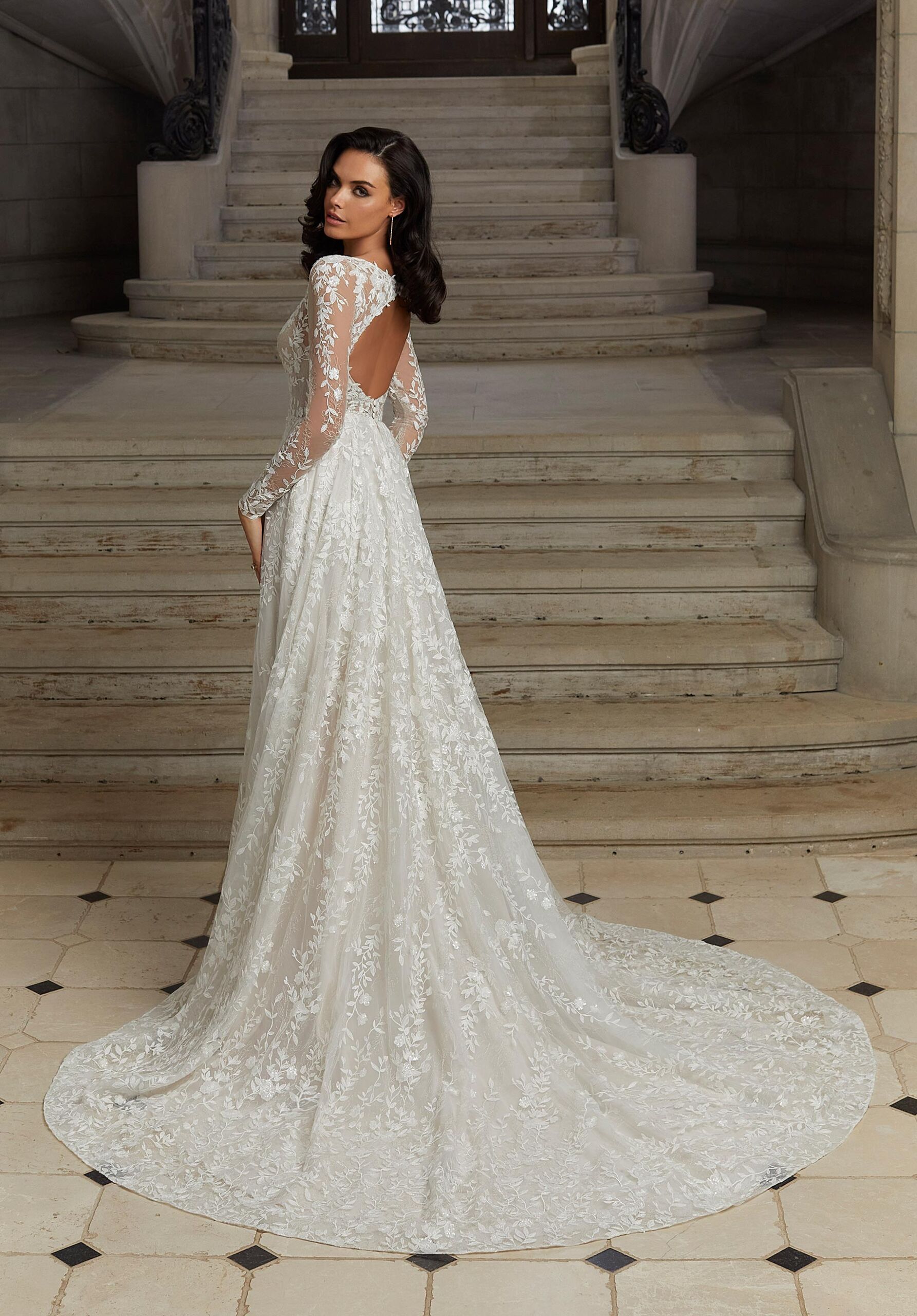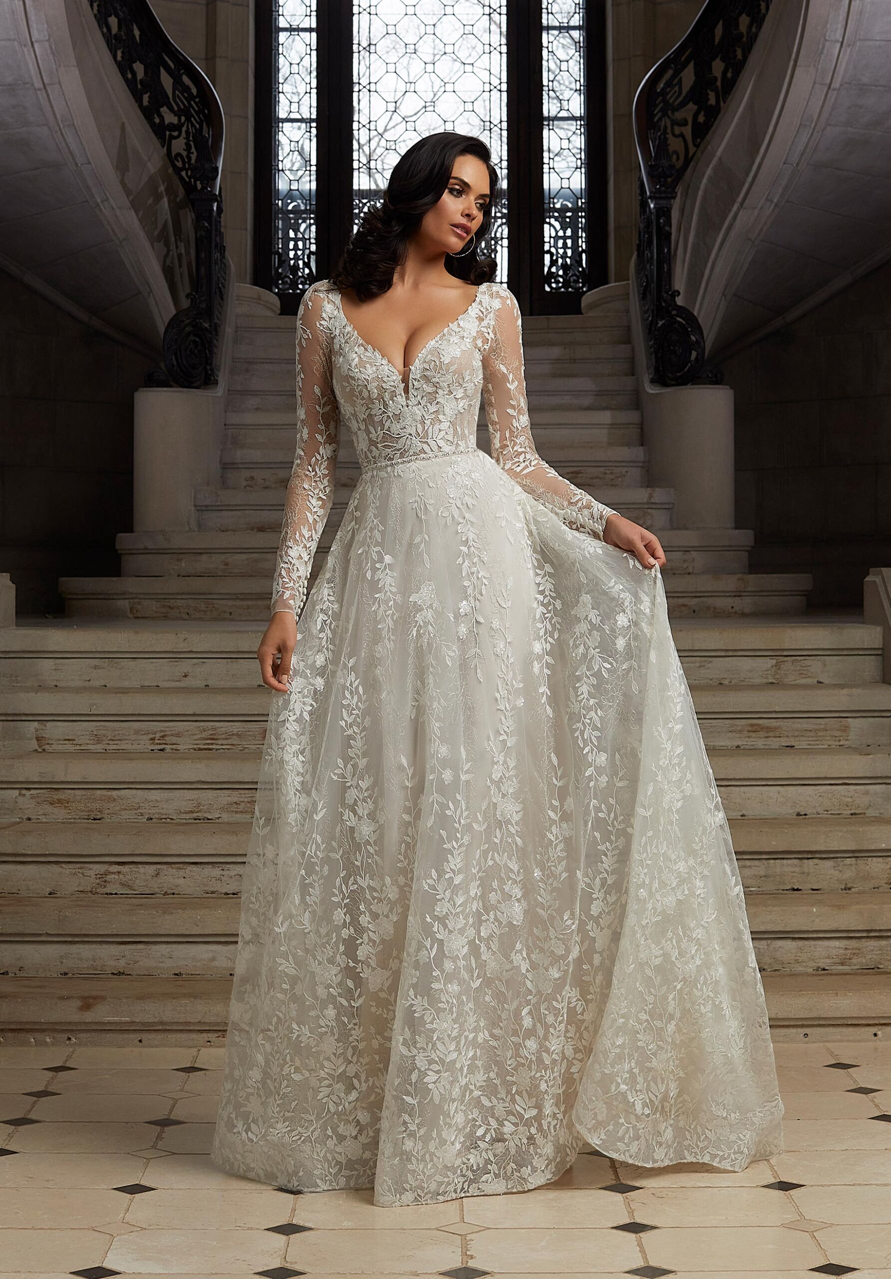 Ethereal elegance, the Constantina designer wedding dress is a dream come true. The soft A-line features romantic details, like its allover frosted, metallic floral embroidery and sheer, embroidered long sleeves. A classic v-neckline meets a delicate keyhole back, while a pearl and crystal beaded waistband adds the perfect touch of sparkle.