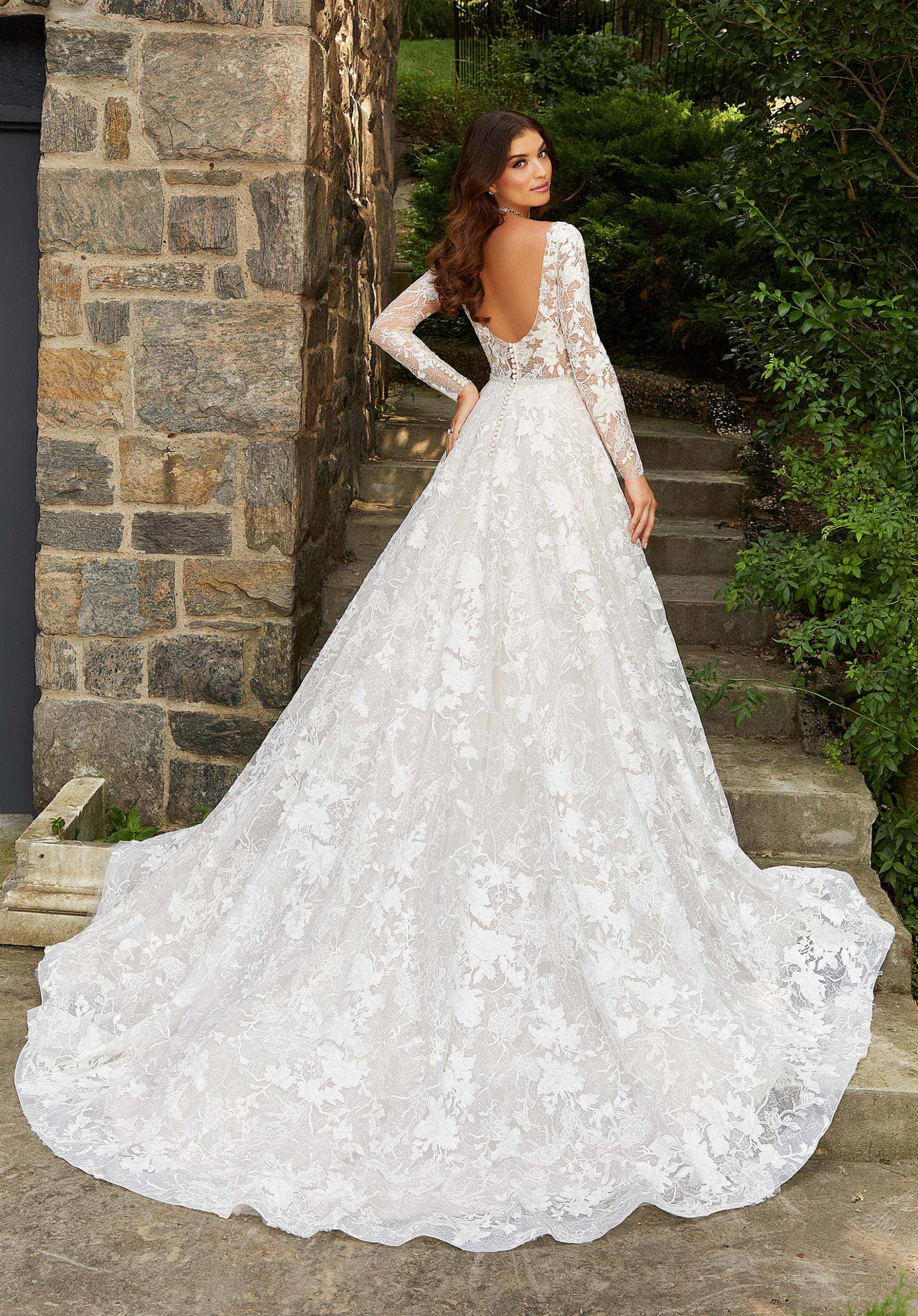 The classic bridal look gets an upgrade in our Emmaline designer wedding dress. Luxe layers of allover embroidery and Alençon lace appliquès over sparkle net creates decadent dimension on this voluminous A-line ballgown. A sculptured, wide v-neckline leads to lovely long sleeves and a beautiful scoop back. A crystal beaded waistline trim finishes off the refined gown with an extra dose of sparkle.