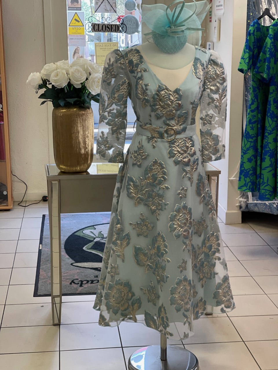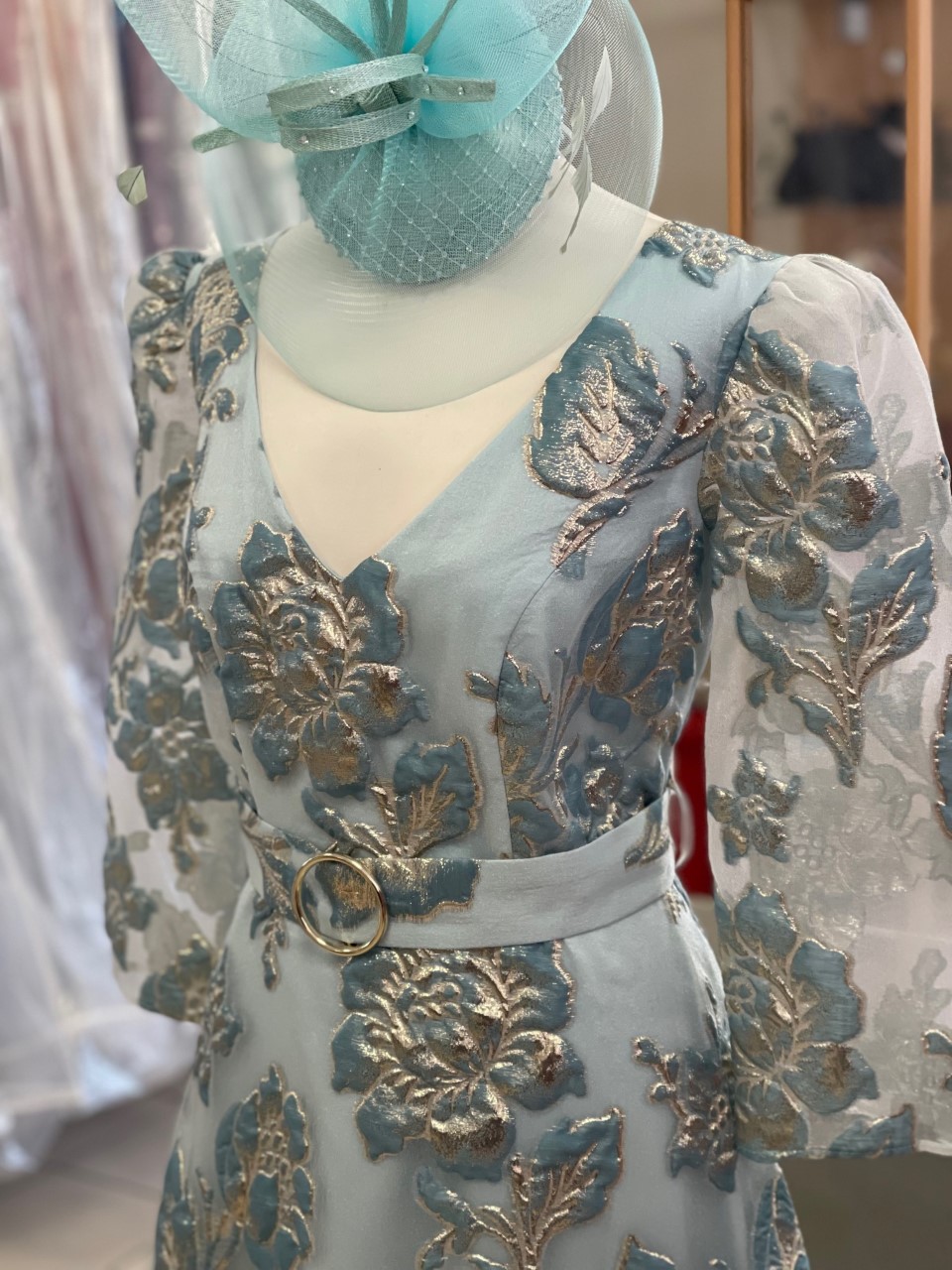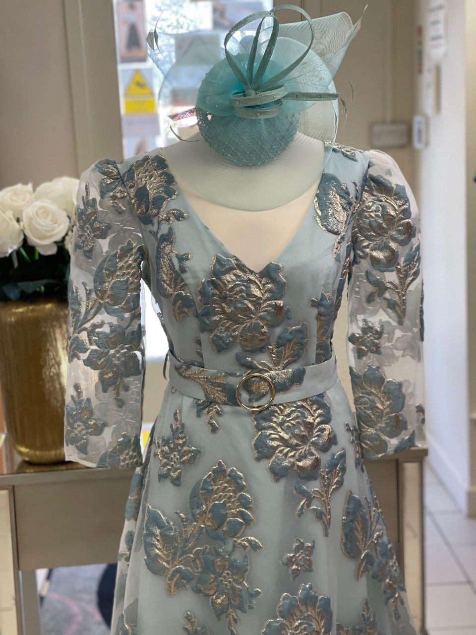 This light and floaty Sonia Pena dress is perfect for a Mother of the Bride or Groom or a guest at a wedding. The V neck and three quarter length sleeves are perfect with an A line shape and a pretty belt detail to show off the waist. The fabric is sheer and lined and the gold and blue on the creamy background is beautiful