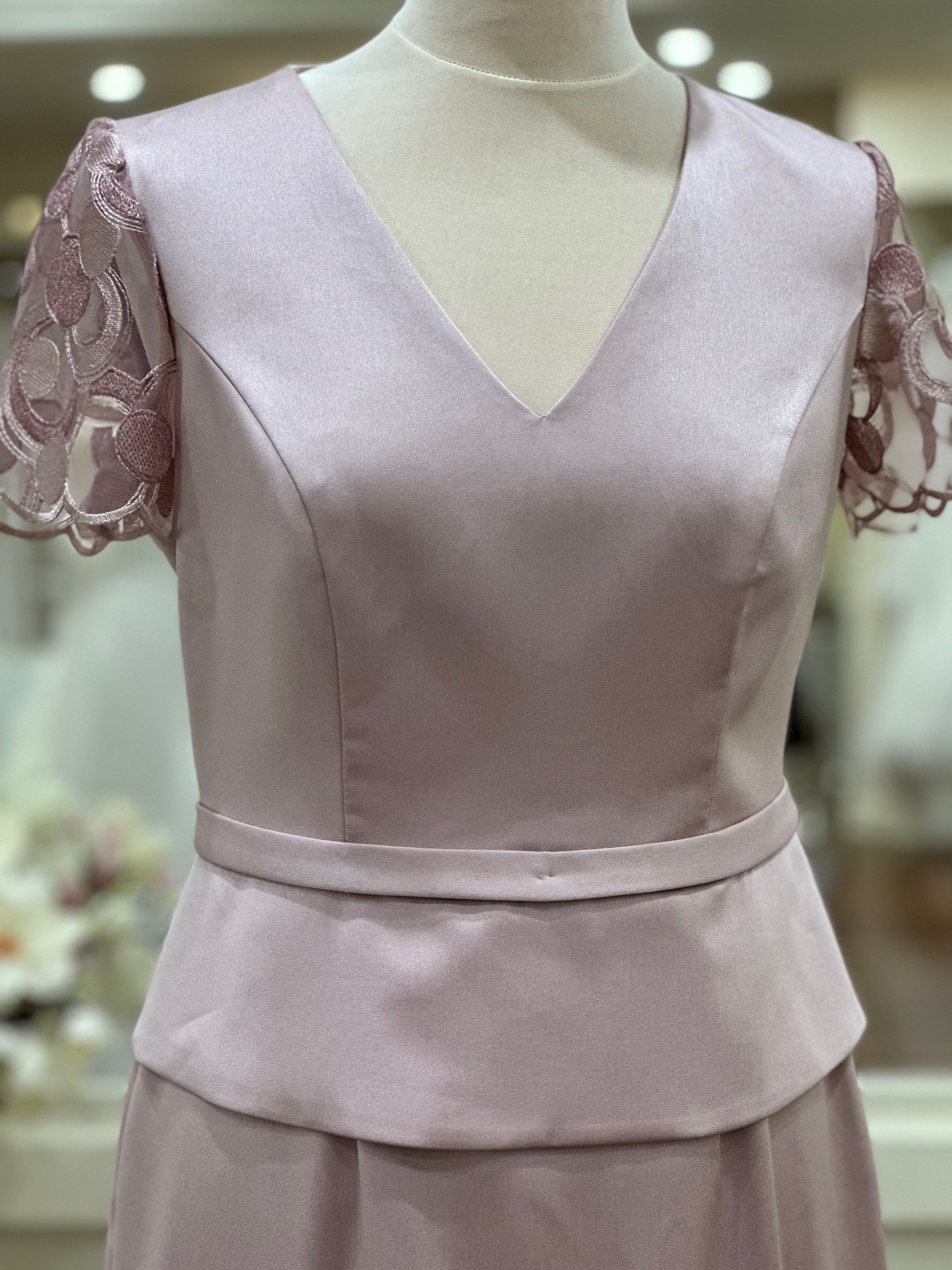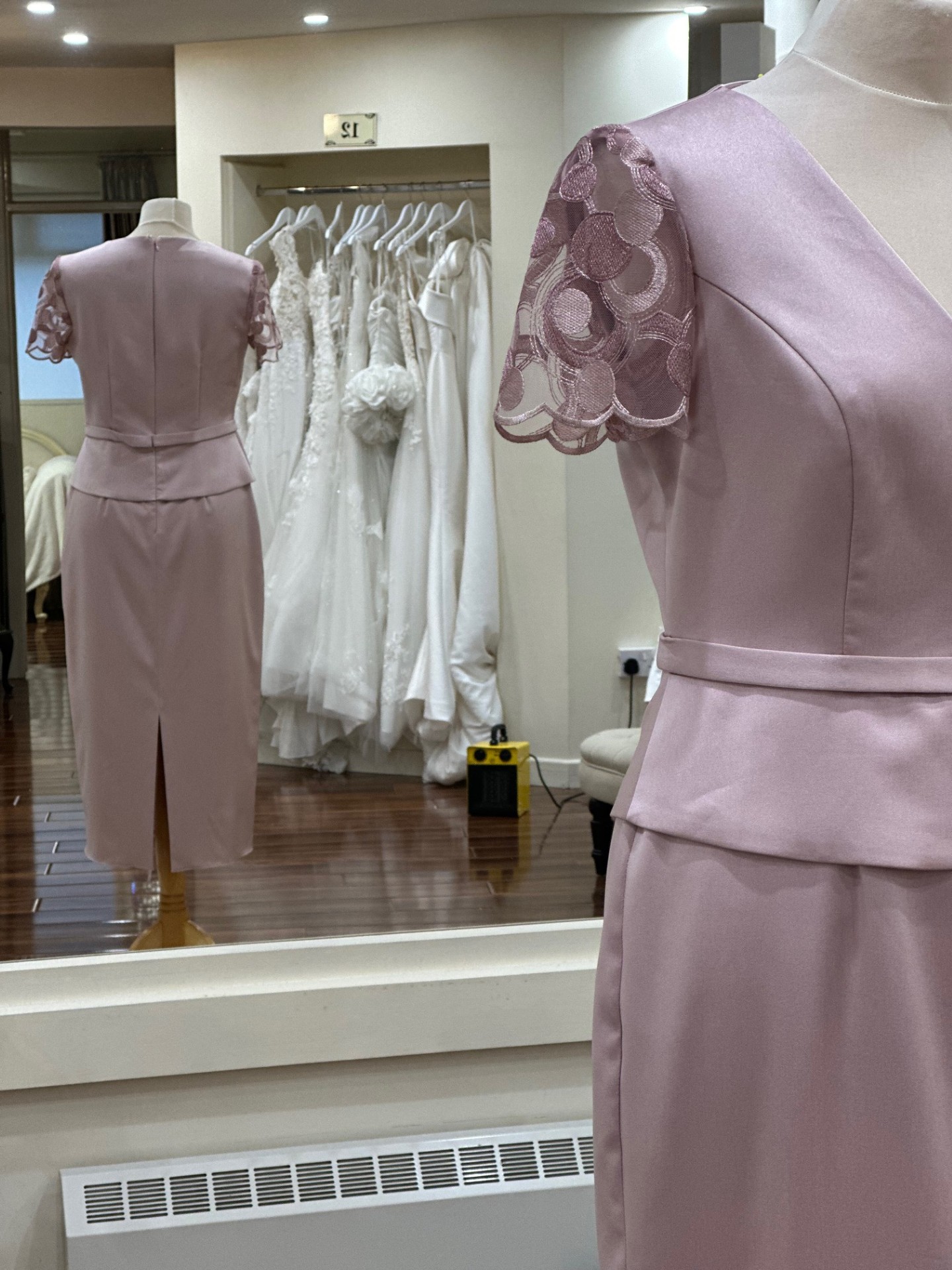 This elegant blush two-piece suit is a timeless choice for a Mother of the Bride or Groom or any special occasion. The look features a softly tailored knee-length dress with a flattering V-neckline, gently cinched at the waist with a subtle embellished detail.