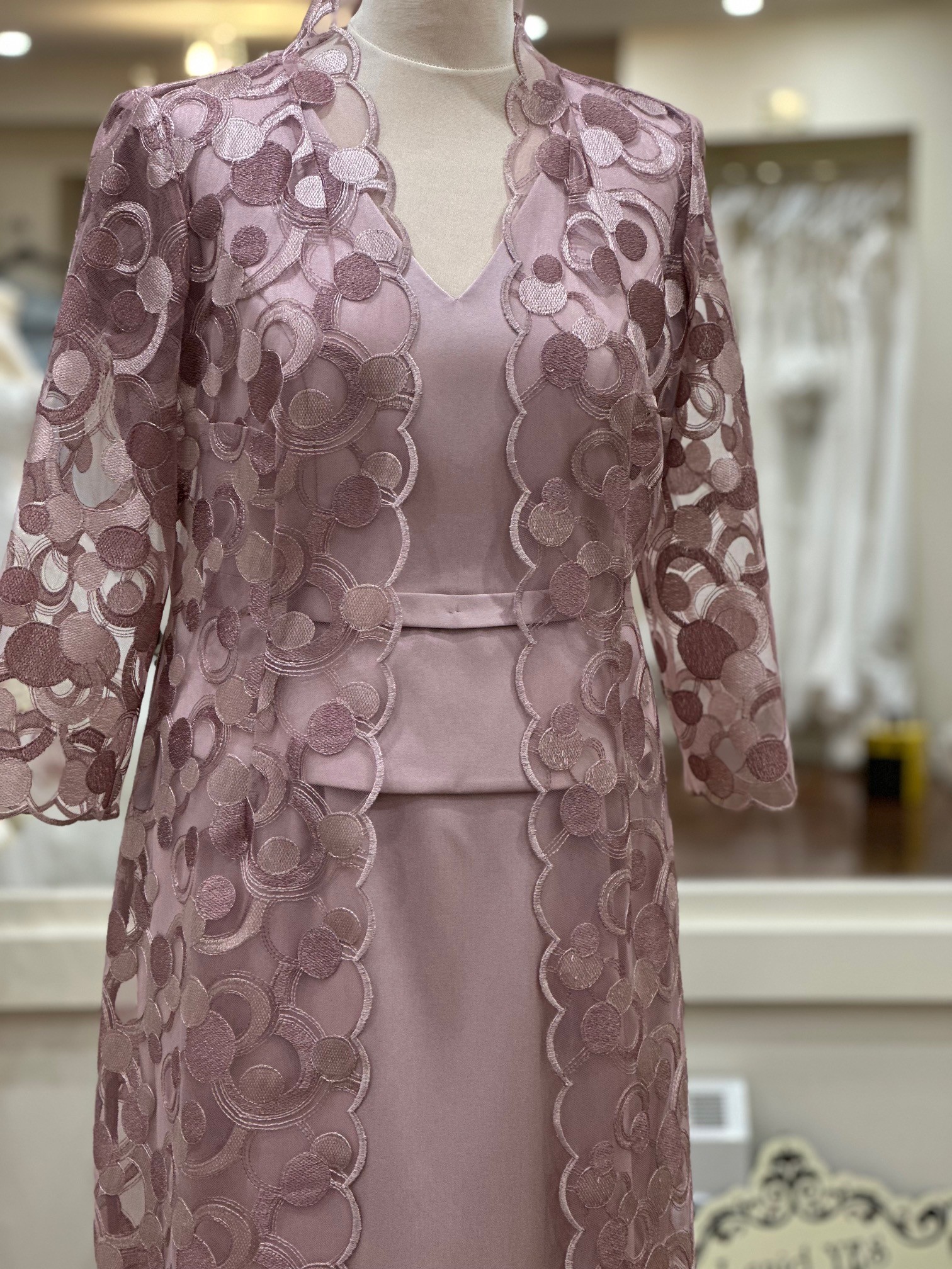 Paired with a beautifully coordinated longline jacket, the ensemble is elevated by intricate floral lace embroidery with a delicate sheer finish. The three-quarter length sleeves add both comfort and sophistication, while the open-front design creates a graceful, elongating silhouette. The soft blush tone is refined and feminine, making it a perfect option for spring and summer celebrations.