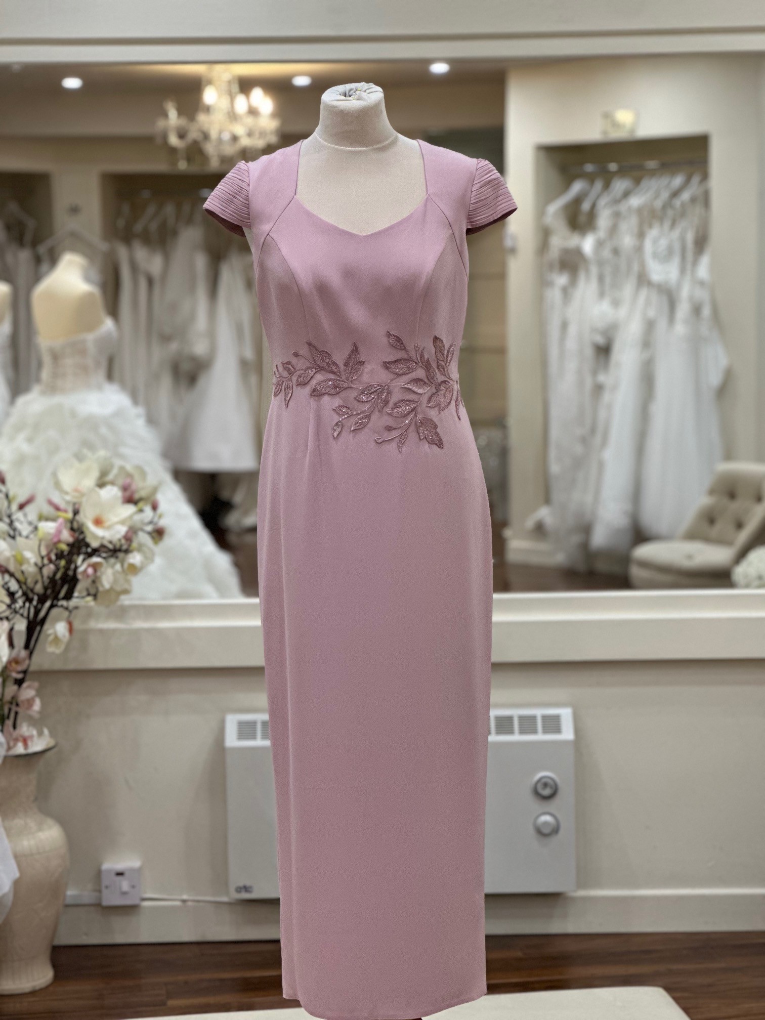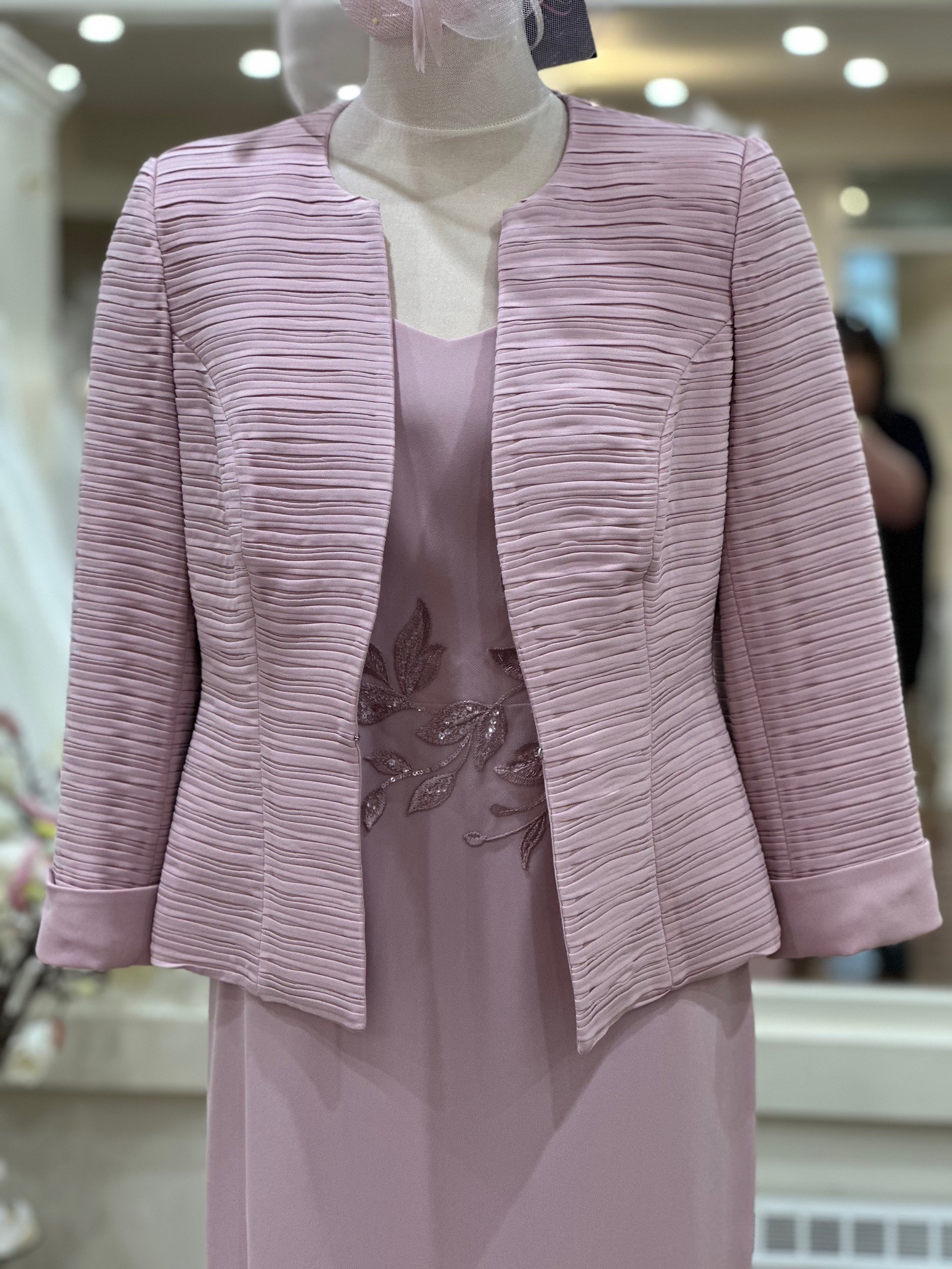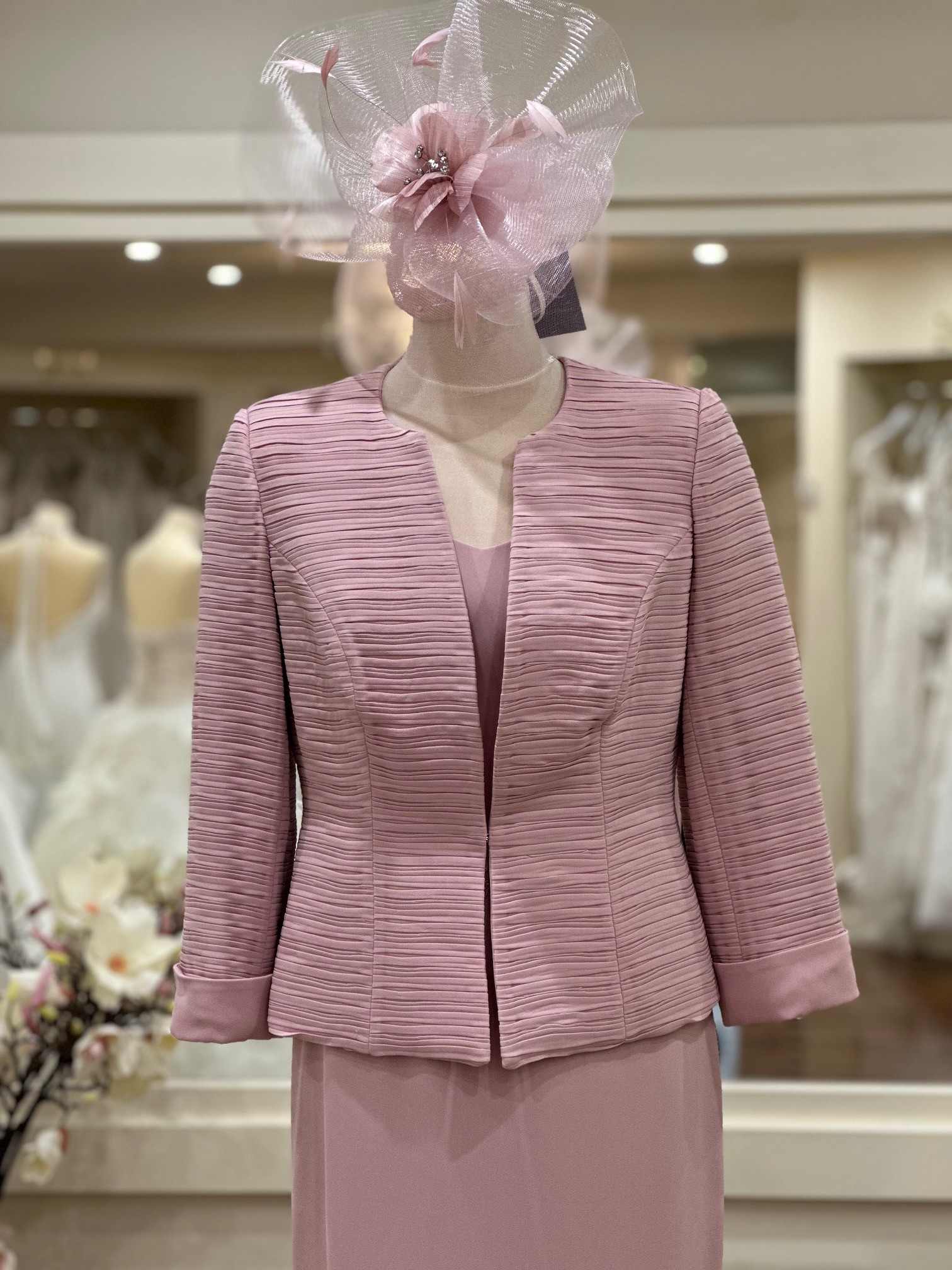 This elegant two-piece occasion suit is a timeless choice for mothers of the bride or groom and special formal events. Crafted in a soft blush pink, the look combines classic tailoring with feminine detail for a refined and flattering silhouette.