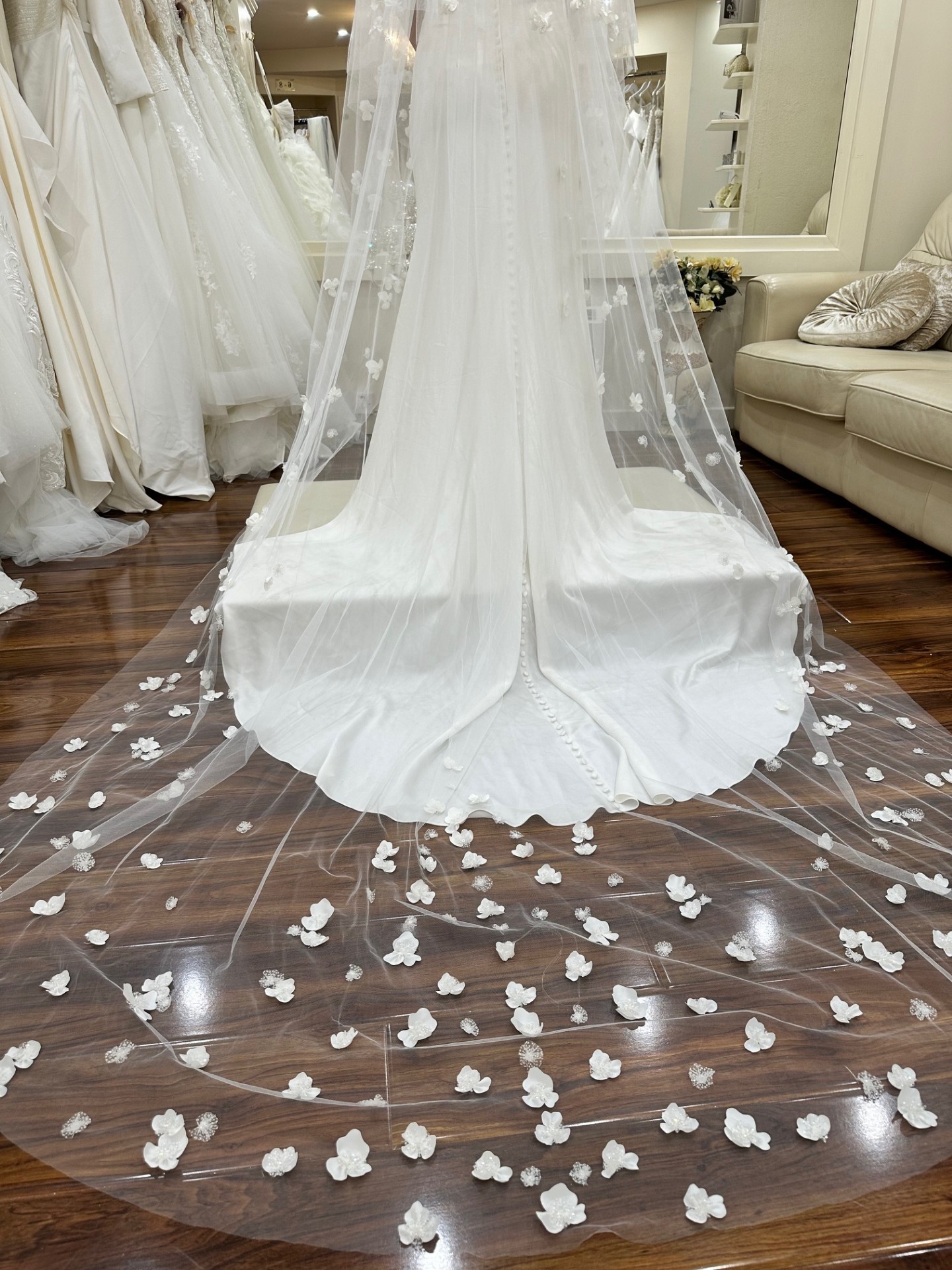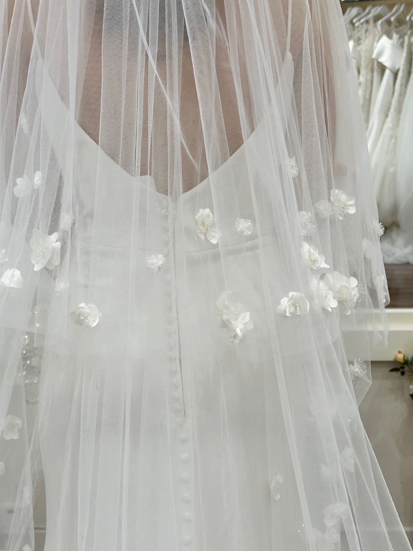 Whimsical cathedral-length veil with three-dimensional floral appliqués.