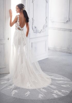 Home / Wedding Dresses / Morilee Wedding Dresses / Main Collection Wedding Dresses / 2378 Calanthe Wedding DressBursting with beauty, Calanthe embraces her floral name with stunning frosted, embroidered nature-inspired appliqués on a plunging v-neck bodice. The low, scoop back is enhanced by radiant sunburst beading, connecting to an airy and ethereal overskirt and sheer train, with a shimmering, patterned sequin skirt underneath.