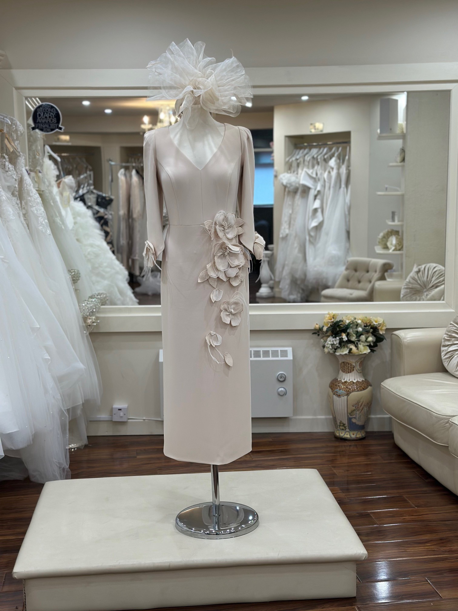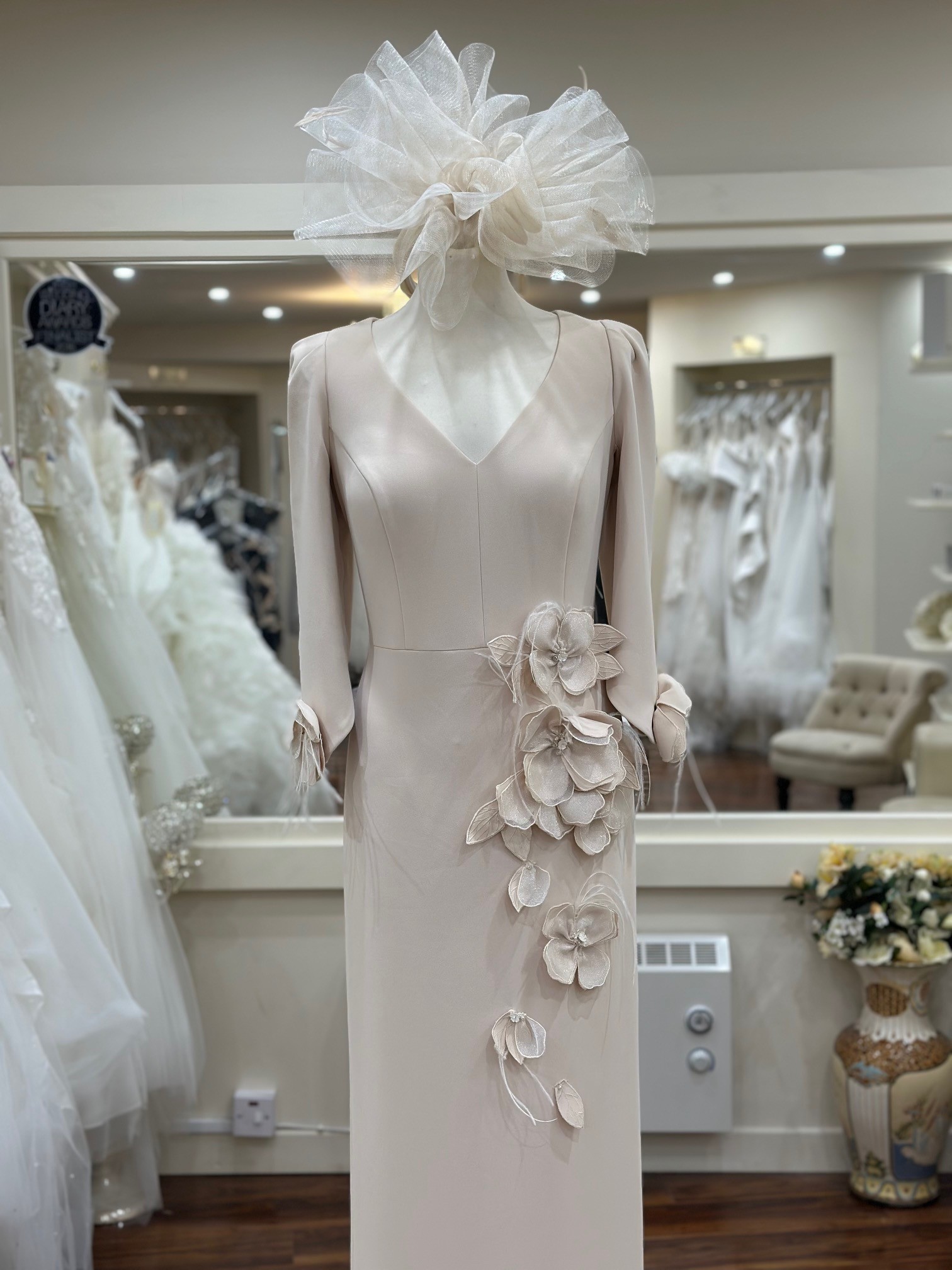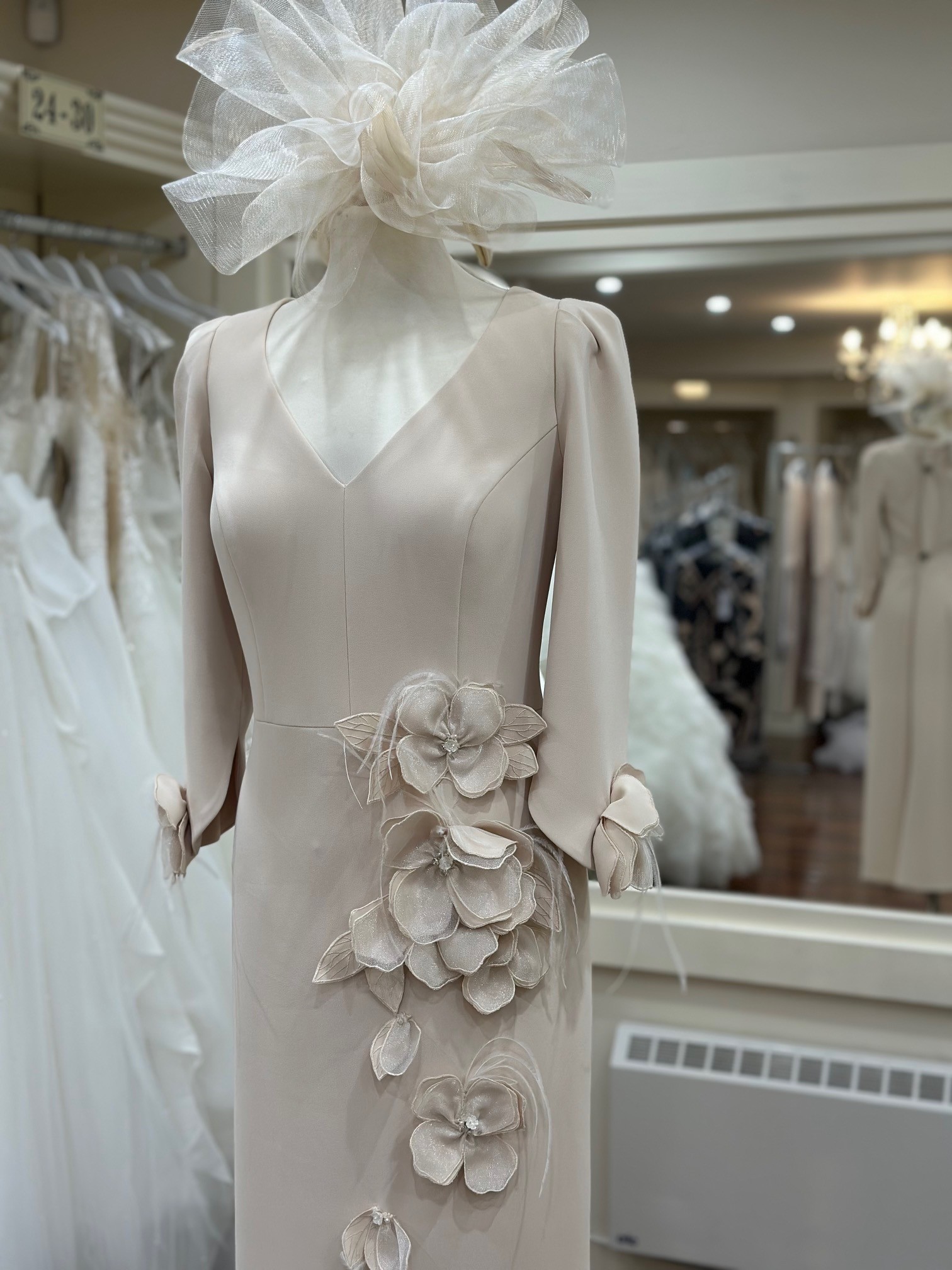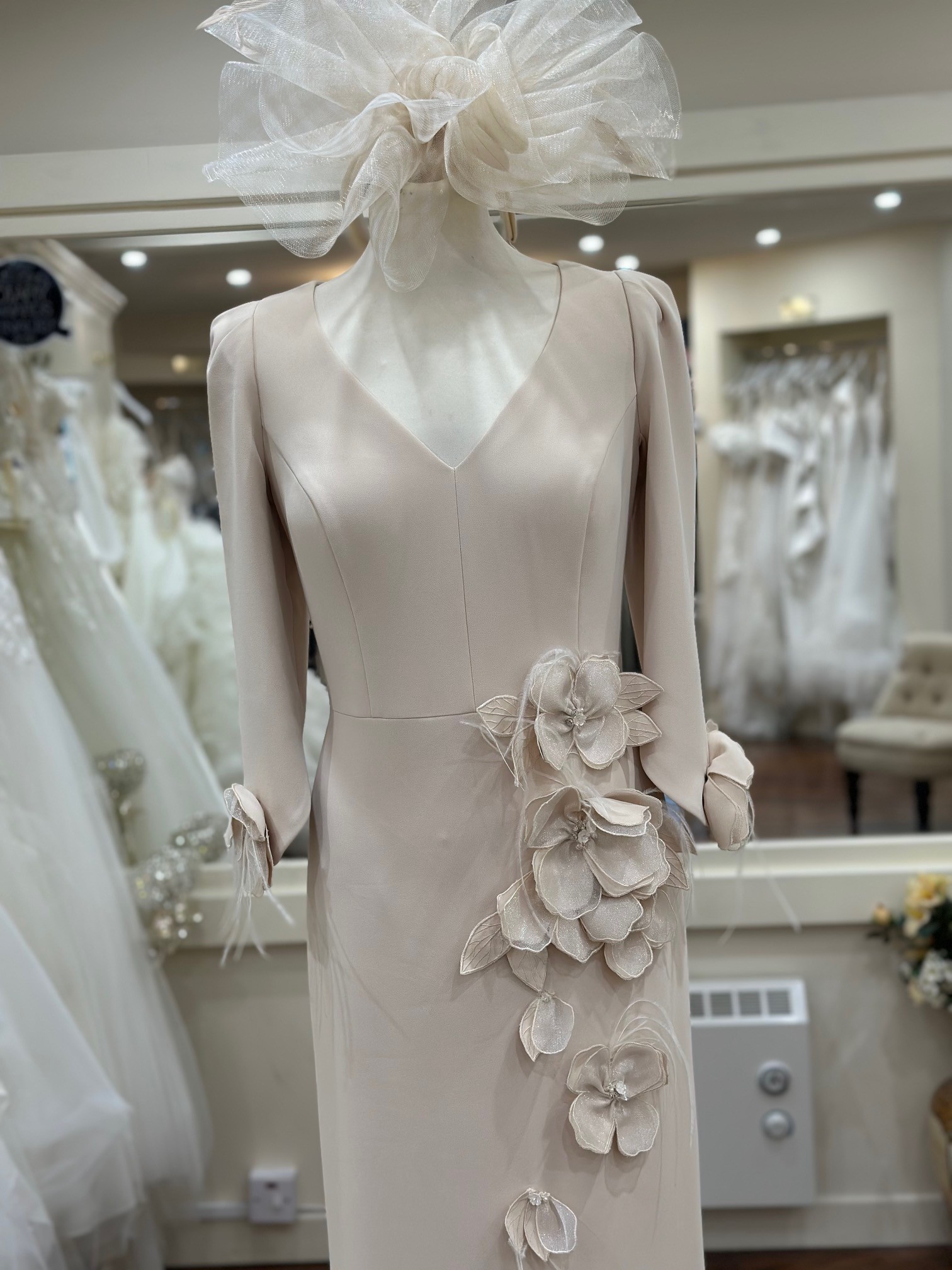 An elegant midi dress in luxurious champagne crepe by Couture Club. This stunning design features a flattering V-neckline and exquisite floral detailing on the sleeve, with soft flowers cascading gracefully down one side of the dress. A sophisticated choice for any special occasion.