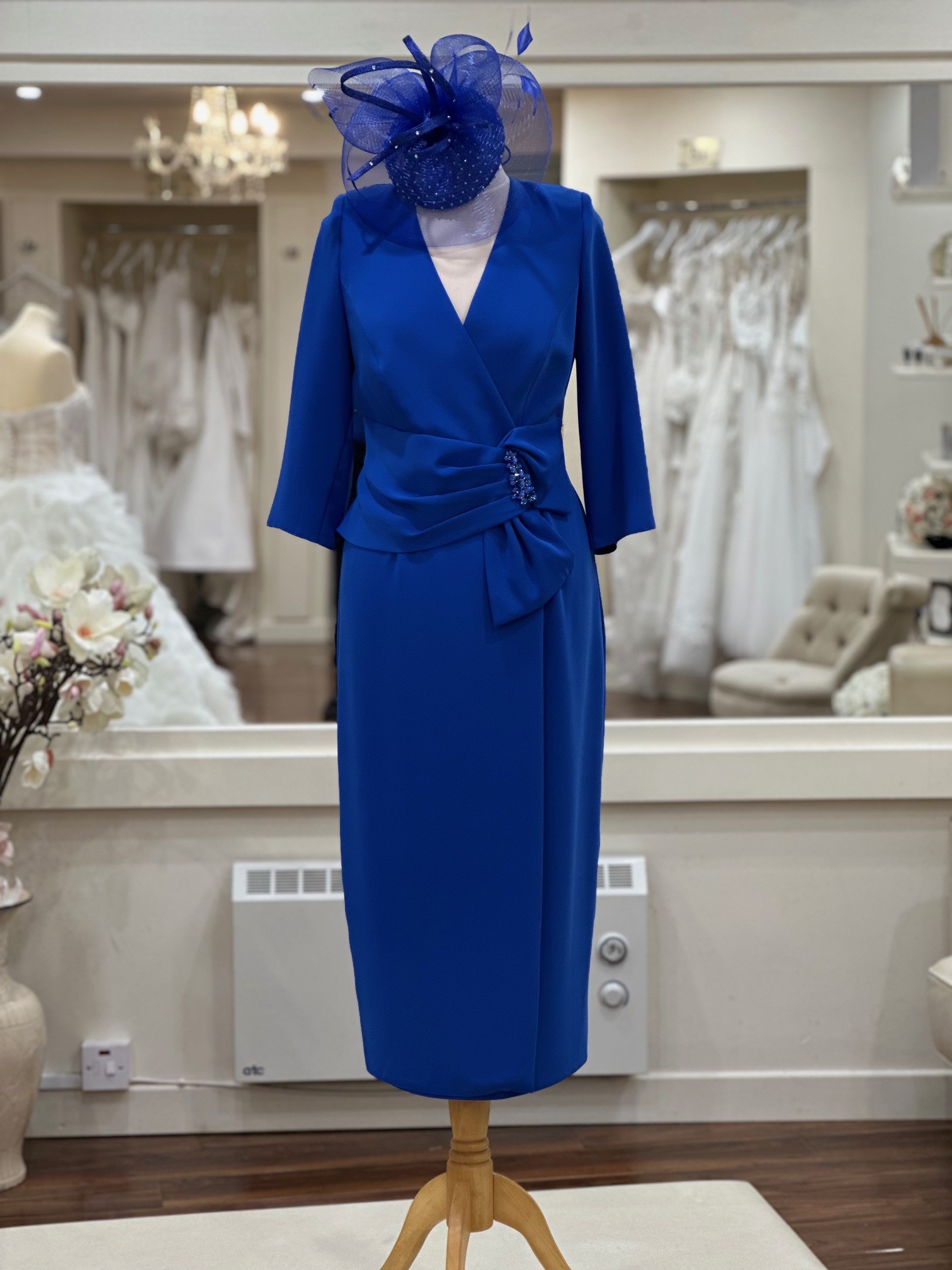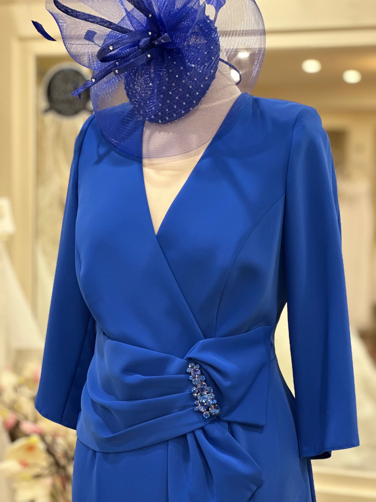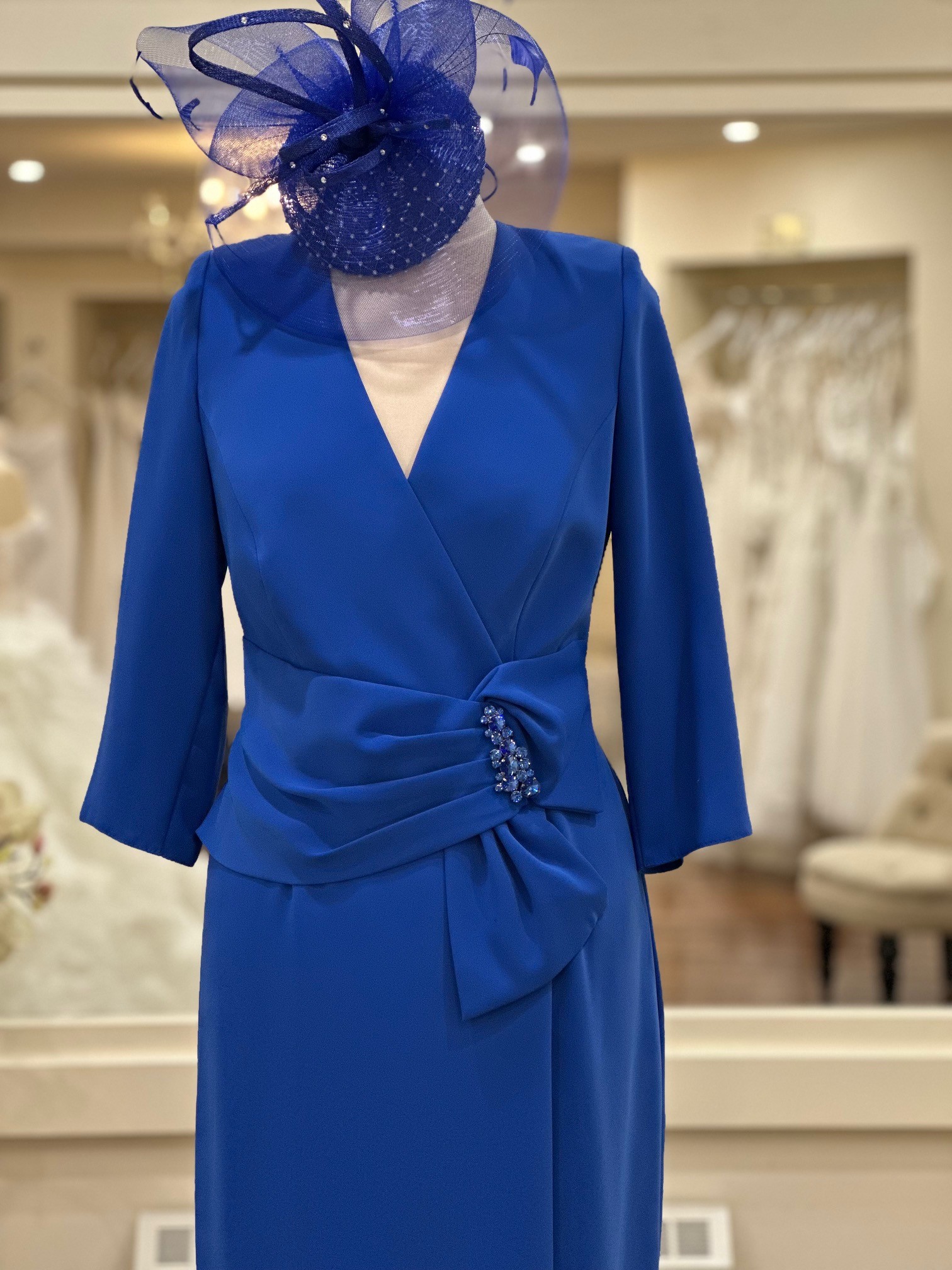 This striking royal blue dress by Sonia Peña is a sophisticated and flattering choice for a Mother of the Bride or Groom or any formal occasion. Crafted in a beautifully structured fabric, the dress features a classic wrap-style bodice with a soft V-neckline that enhances the silhouette while offering elegant coverage.