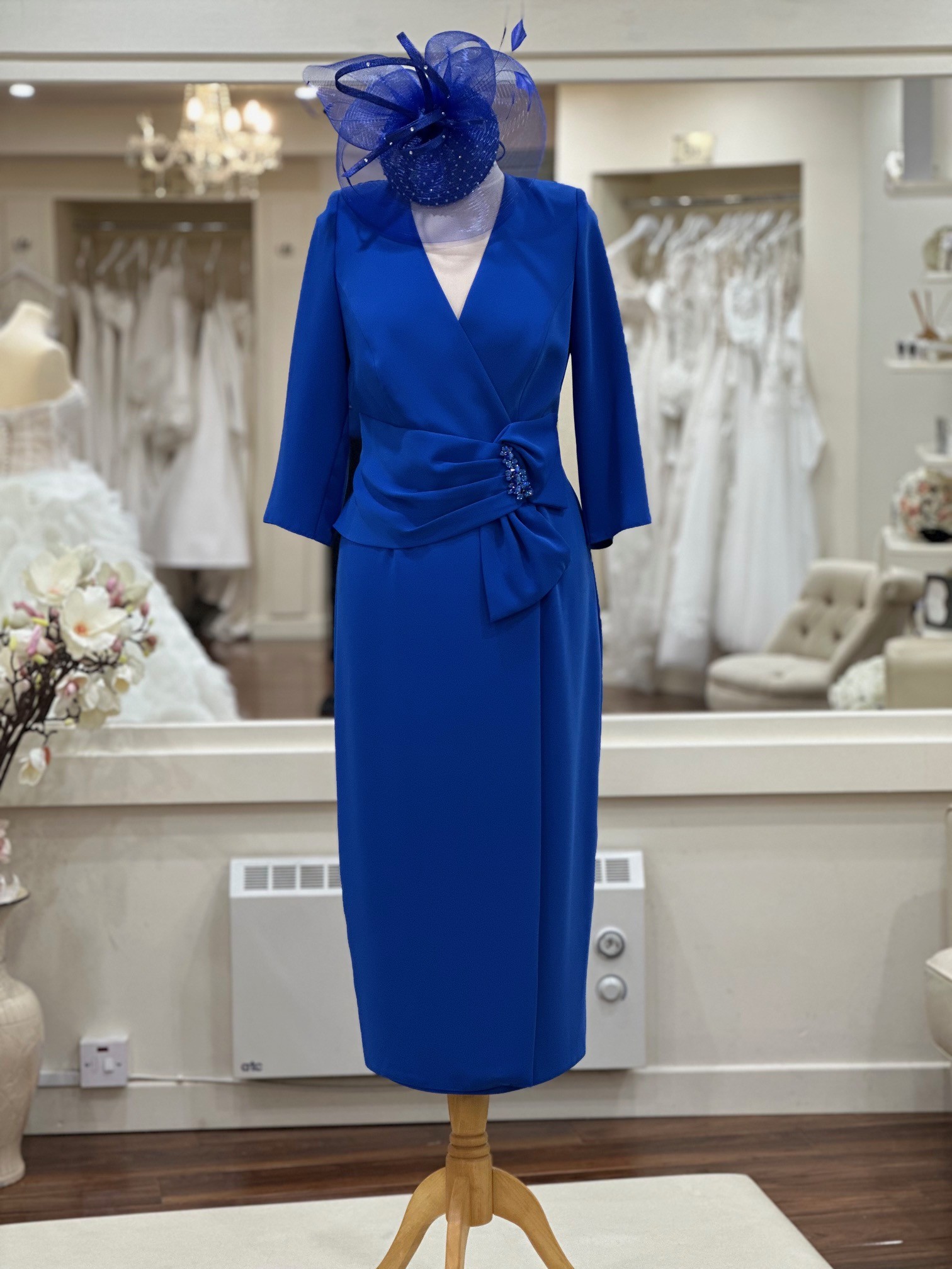 The waist is gently defined with a sculpted drape and finished with a delicate beaded embellishment, adding a subtle touch of sparkle and refinement. Three-quarter length sleeves provide comfort and confidence, while the streamlined skirt falls gracefully below the knee for a timeless, elongating finish.
