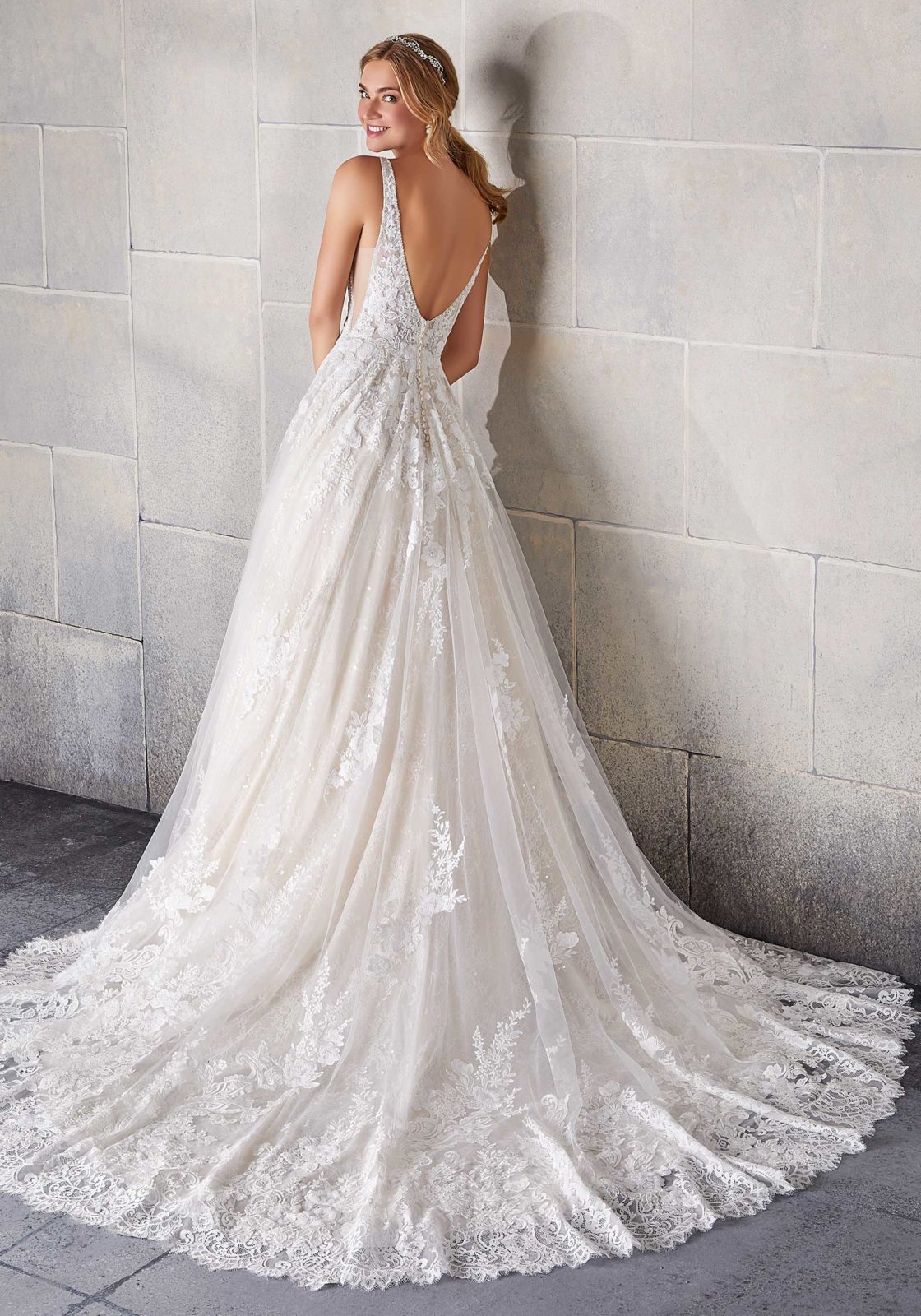 Home / Wedding Dresses / Morilee Wedding Dresses / Main Collection Wedding Dresses / 2142 SuzanneBoho meets luxe in our Suzanne wedding gown. Featuring a diamanté and crystal beaded trimmed v-neck bodice, with delicately beaded, embroidered appliqués. A net over sequined chantilly lace ball gown skirt with a wide scalloped hemline completes the look.