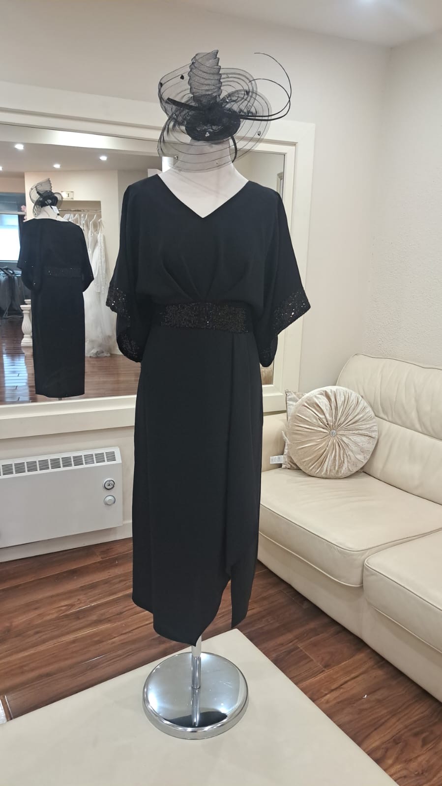 Designed in classic black, this dress combines understated glamour with a beautifully flattering silhouette.