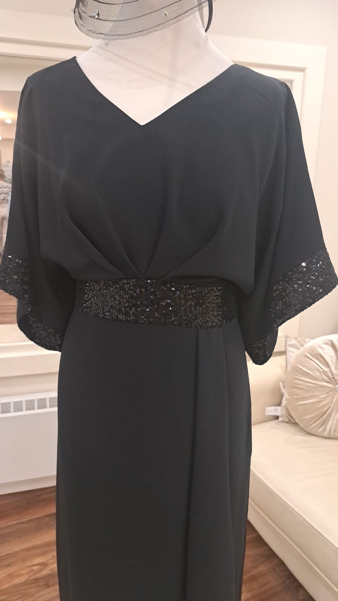 Featuring a soft V-neckline, the dress is finished with gently draped short sleeves that offer coverage. A delicately embellished waistband adds subtle sparkle and definition at the waist.