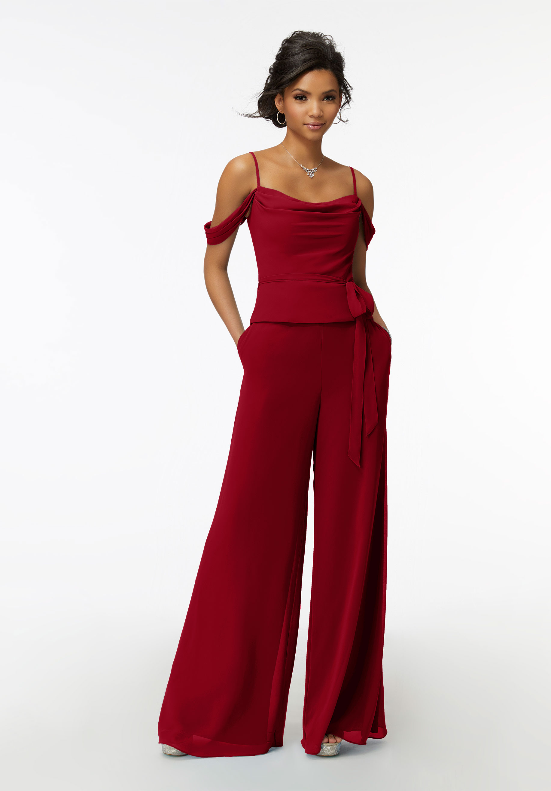 Unique two-piece chiffon bridesmaid pantsuit with a cold shoulder detail and tied sash at the waist to help define your figure. Shown in Slate