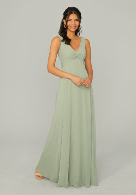 Chiffon bridesmaid dress features a v-neckline with a unique knotted bodice detail.