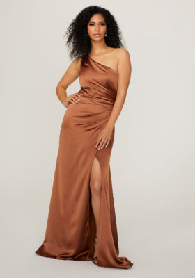 Chic one-shoulder bridesmaid dress is lustrous silky satin with ruched waist detail and front skirt slit. Shown in Bronze.