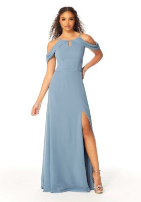 Home / Bridesmaids / Bridesmaids Dresses / 21809 Morilee Bridesmaid DressElegant chiffon bridesmaid dress has a high square neckline with v-notch detail and dreamy draped off-the-shoulder sleeves. The airy chiffon skirt features a slit for a sultry touch. Shown in Slate