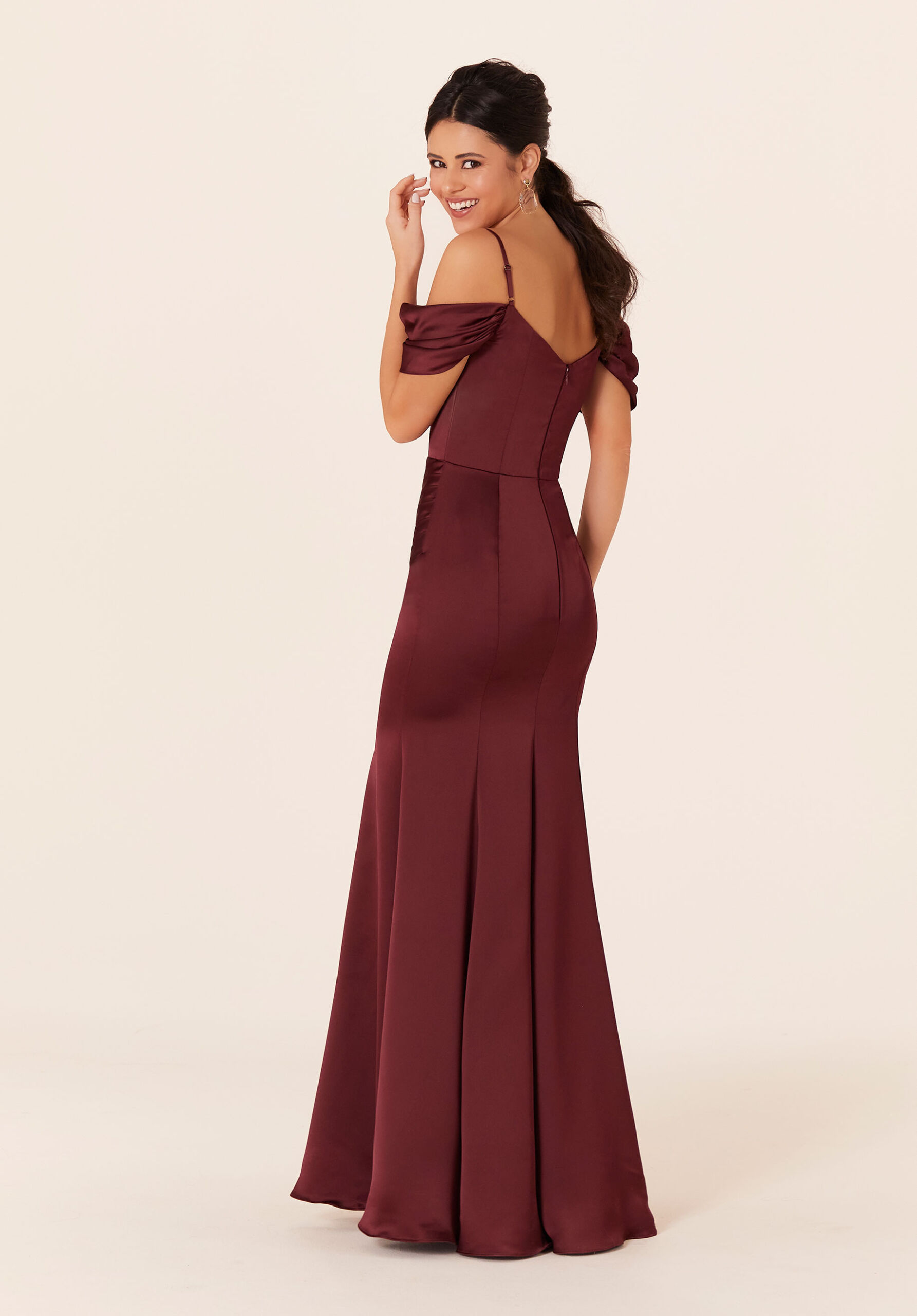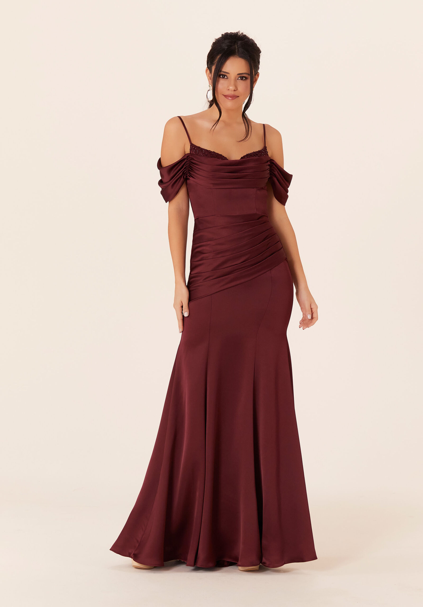 Luxe fit and flare bridesmaid dress with dreaped details and beaded neckline in luxe satin.