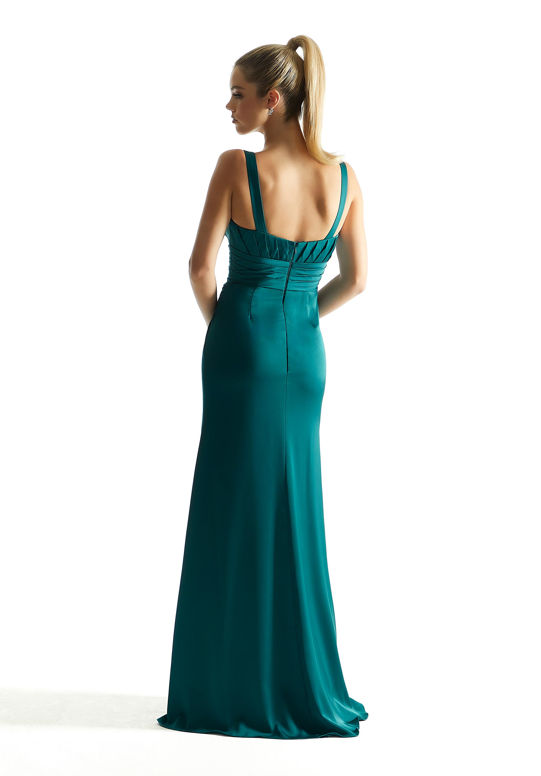 Home / Bridesmaids / Bridesmaids Dresses / 21846 Morilee Bridesmaids DressStunning bridesmaid dress in luminous luxe satin has a pleated bust and draped waist creating an empire bodice with a sultry open neckline. The skirt has a faux-wrap effect creating a flattering drape and a front skirt slit for a pop of leg