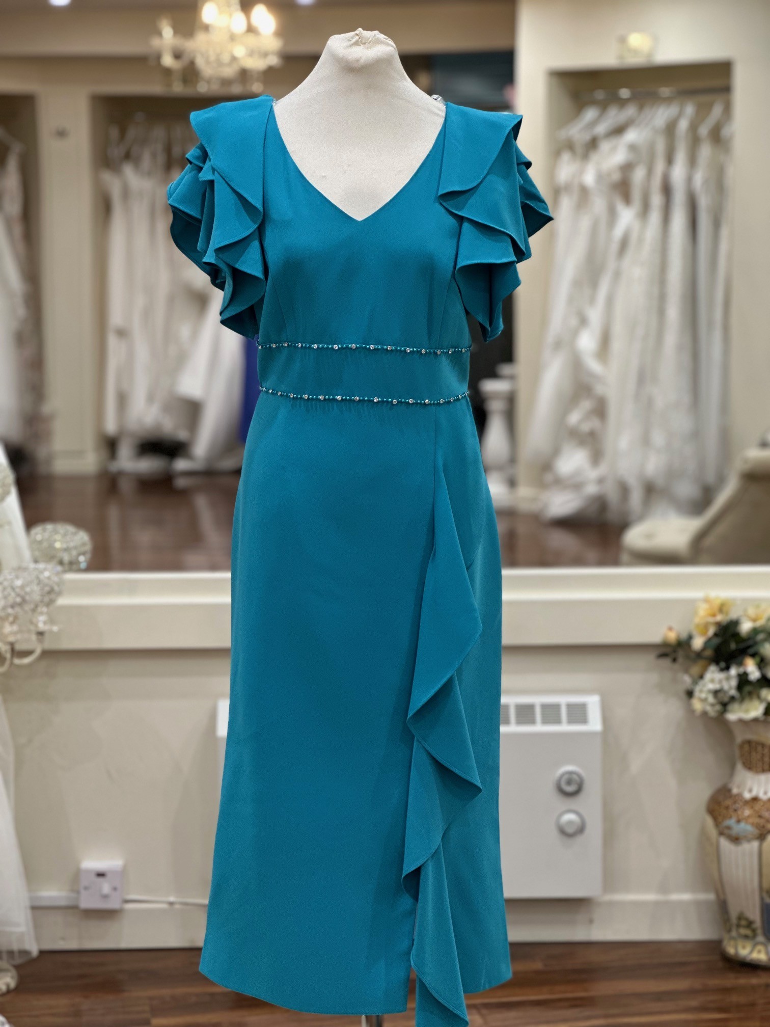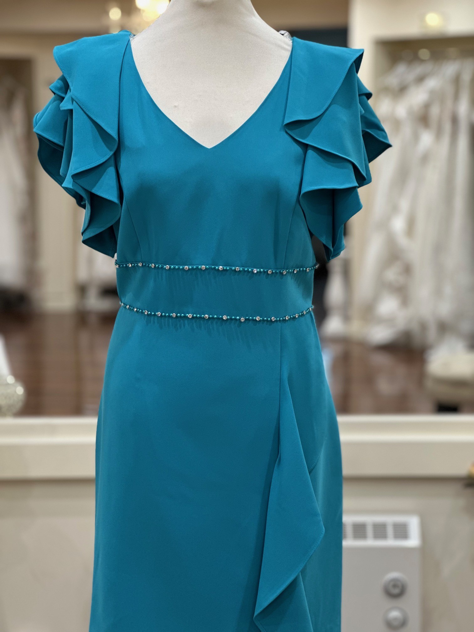 Designed in a rich jade tone, this dress offers a flattering silhouette. Featuring a classic V-neckline, the bodice is complemented by soft layered flutter sleeves. A delicately embellished waistband defines the waist with sparkle, the skirt falls to a flattering midi length.