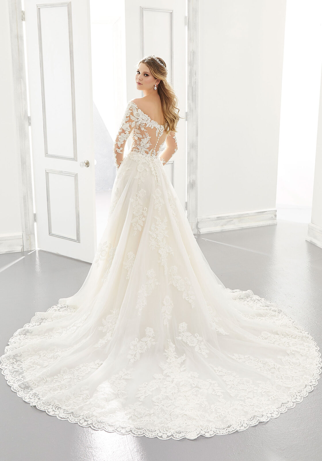 Home / Wedding Dresses / Morilee Wedding Dresses / Main Collection Wedding Dresses / 2196 AmbrosiaOur Ambrosia gown is a true classic bridal beauty. Featuring a stunning off the shoulder long sleeved bodice, accented in frosted Alençon and embroidered appliqués that cascade onto the Tulle Ball Gown skirt. An intricate illusion back and wide scalloped hemline complete the look.
