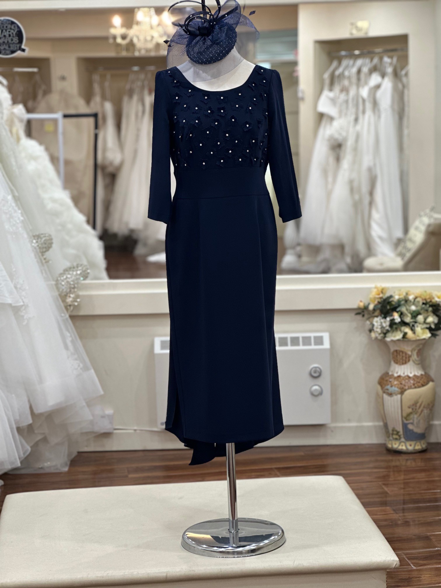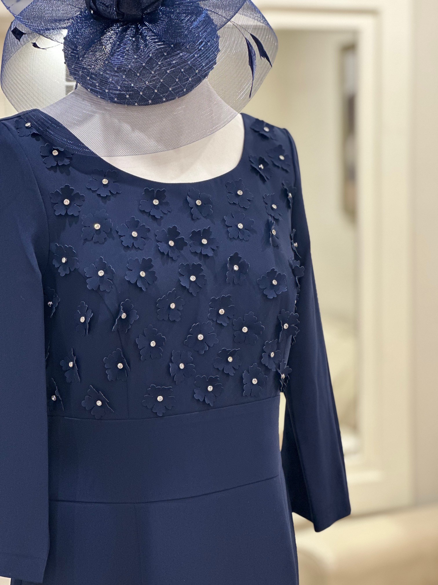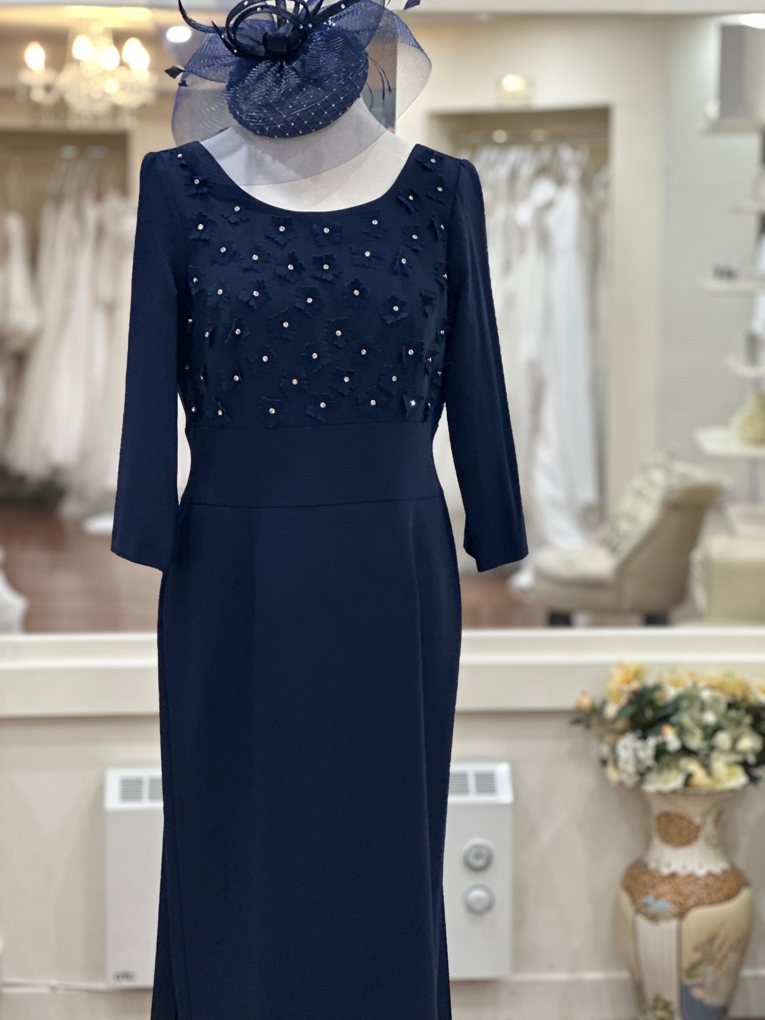 Featuring 3D flowers with small diamontes, long sleeves and a fitted skity with a small overskirt at the back this dress is perfect for any special occasion