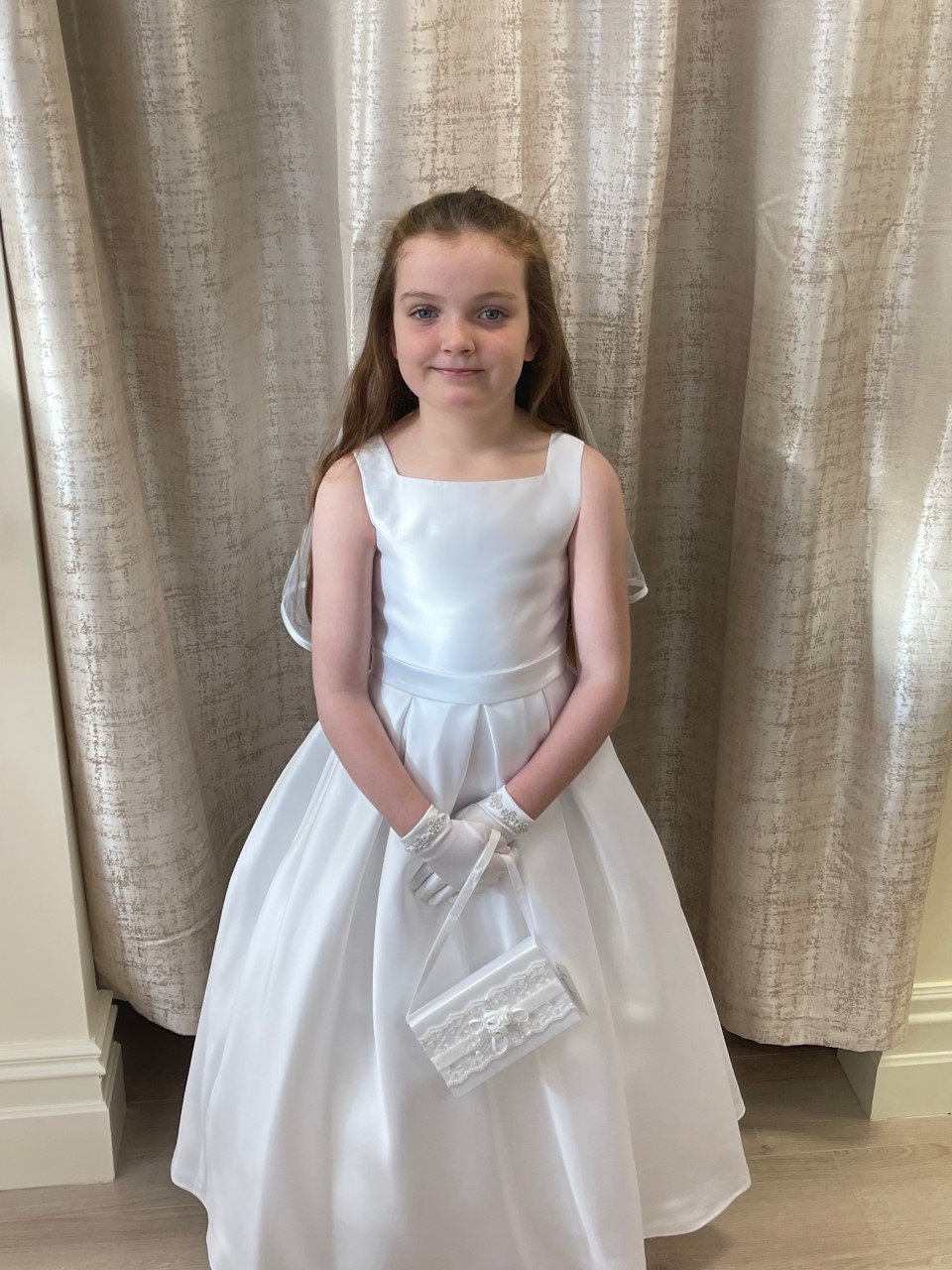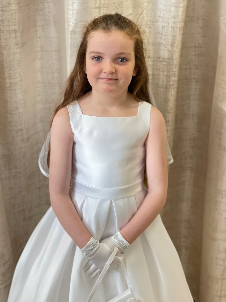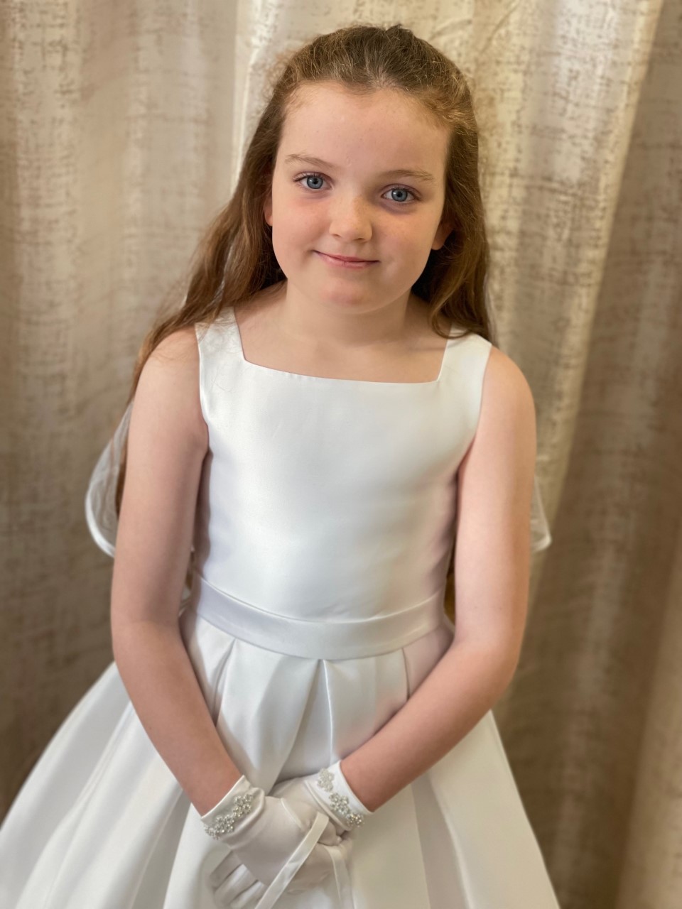 A mikado satin with a square neckline and a fabulous bow to the back - Modelled by Lily