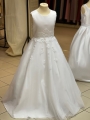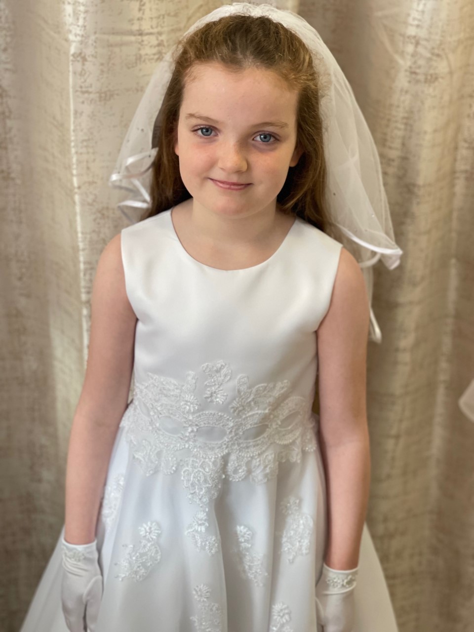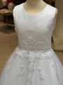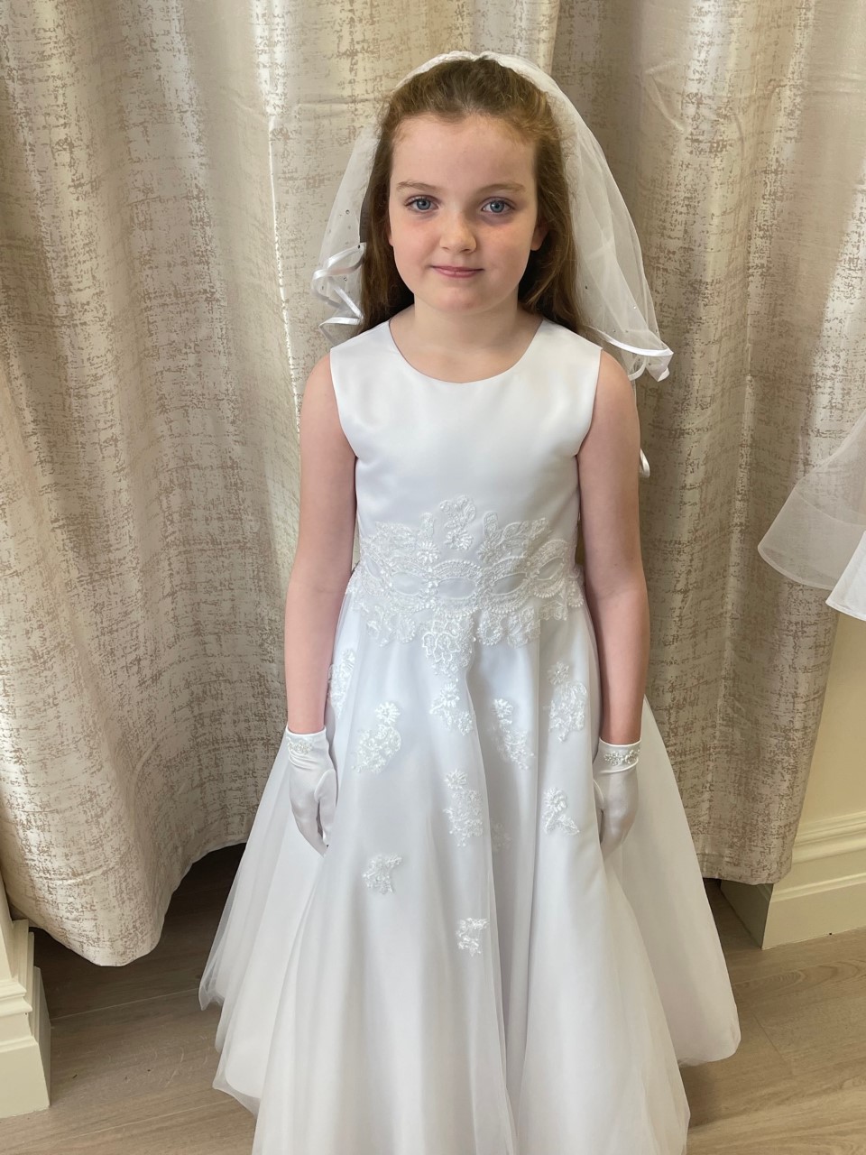 This communion dress is satin and tulle and has beaded detailing around the waist - Modelled by Lily