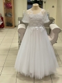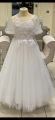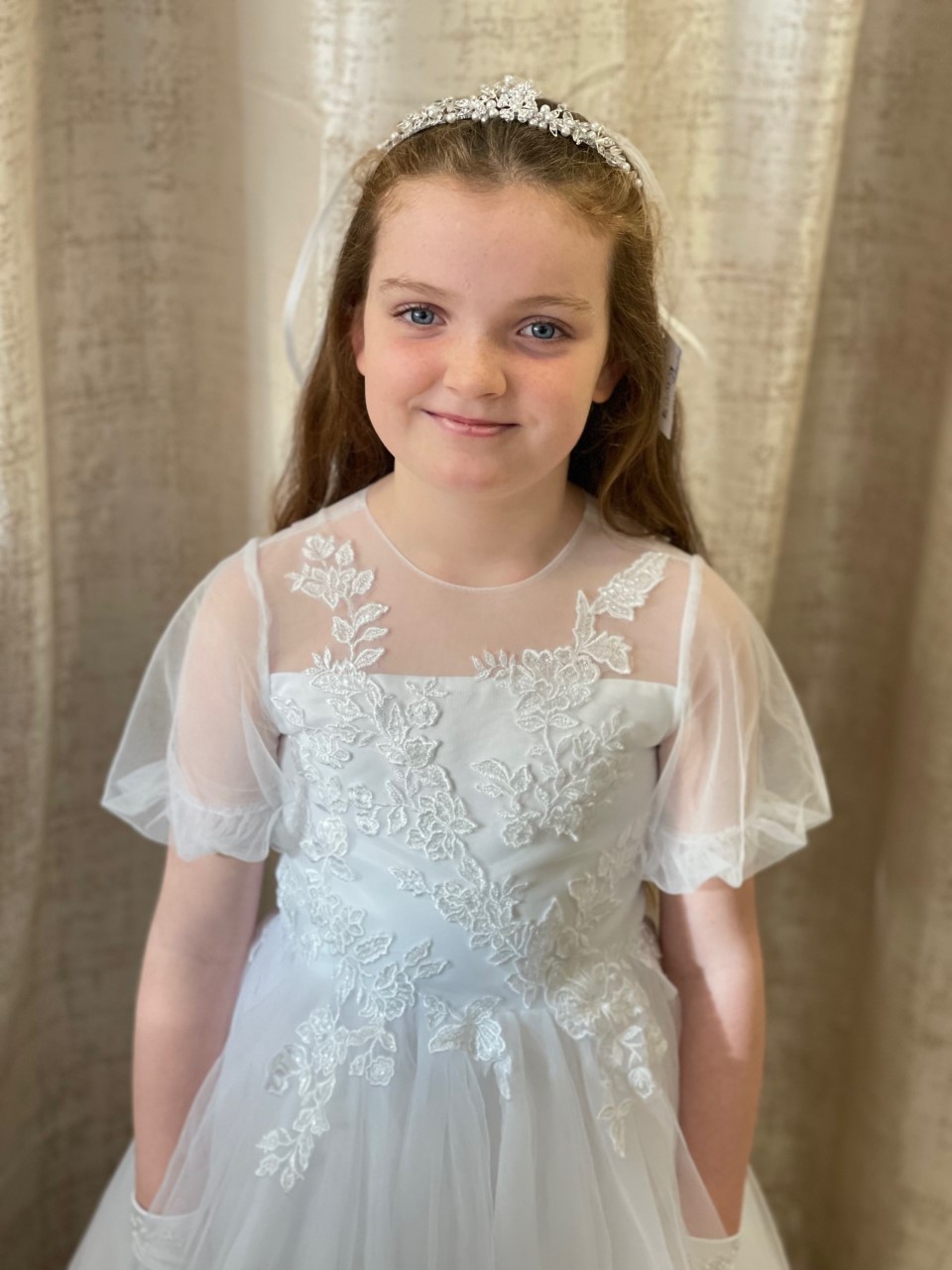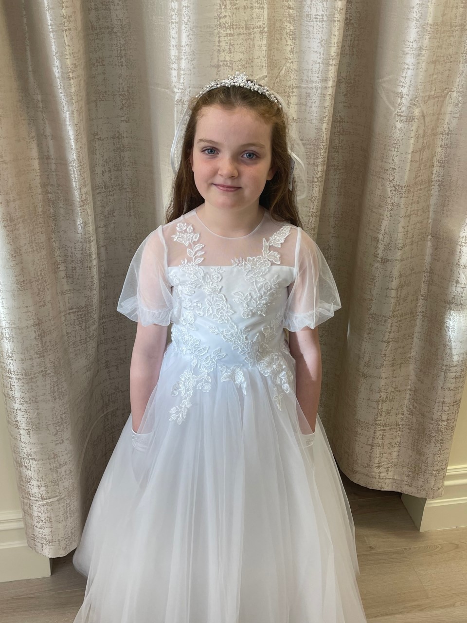A full length lace and tulle communion dress in white with a beautiful puff sleeve - Modelled by Lily