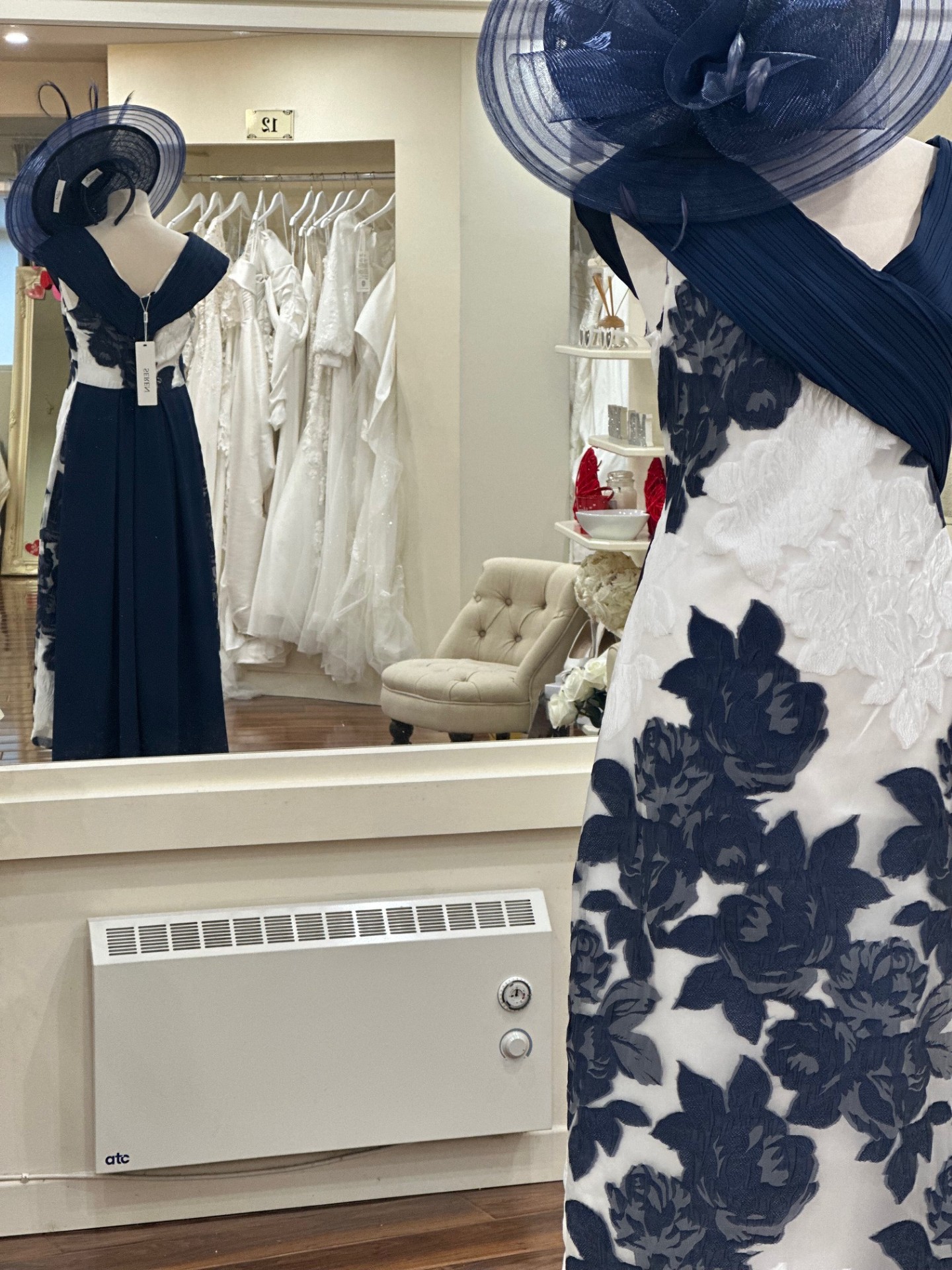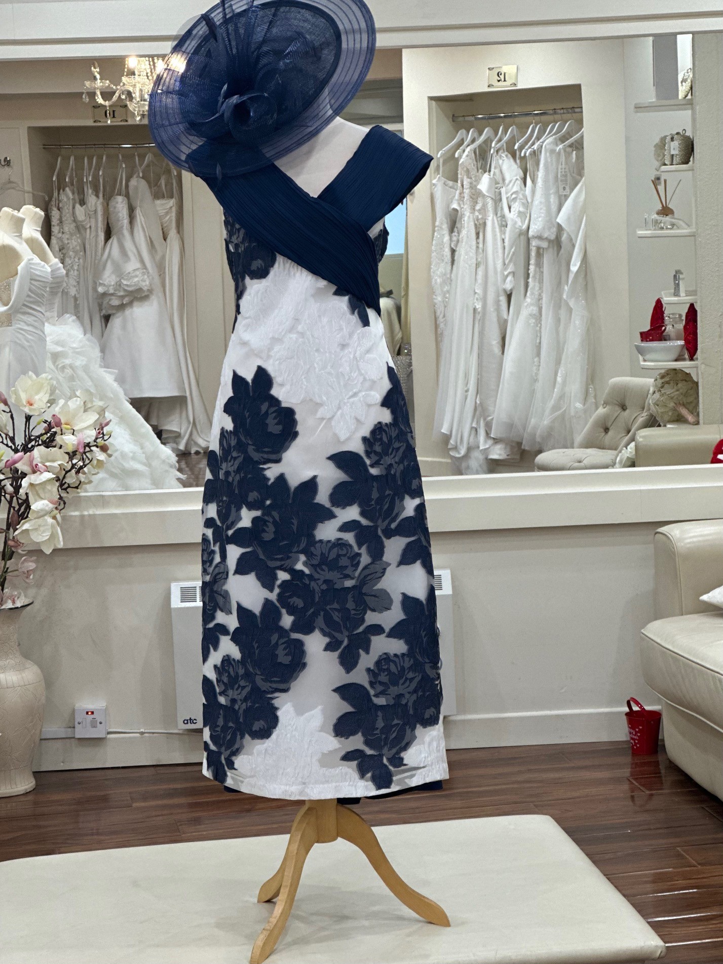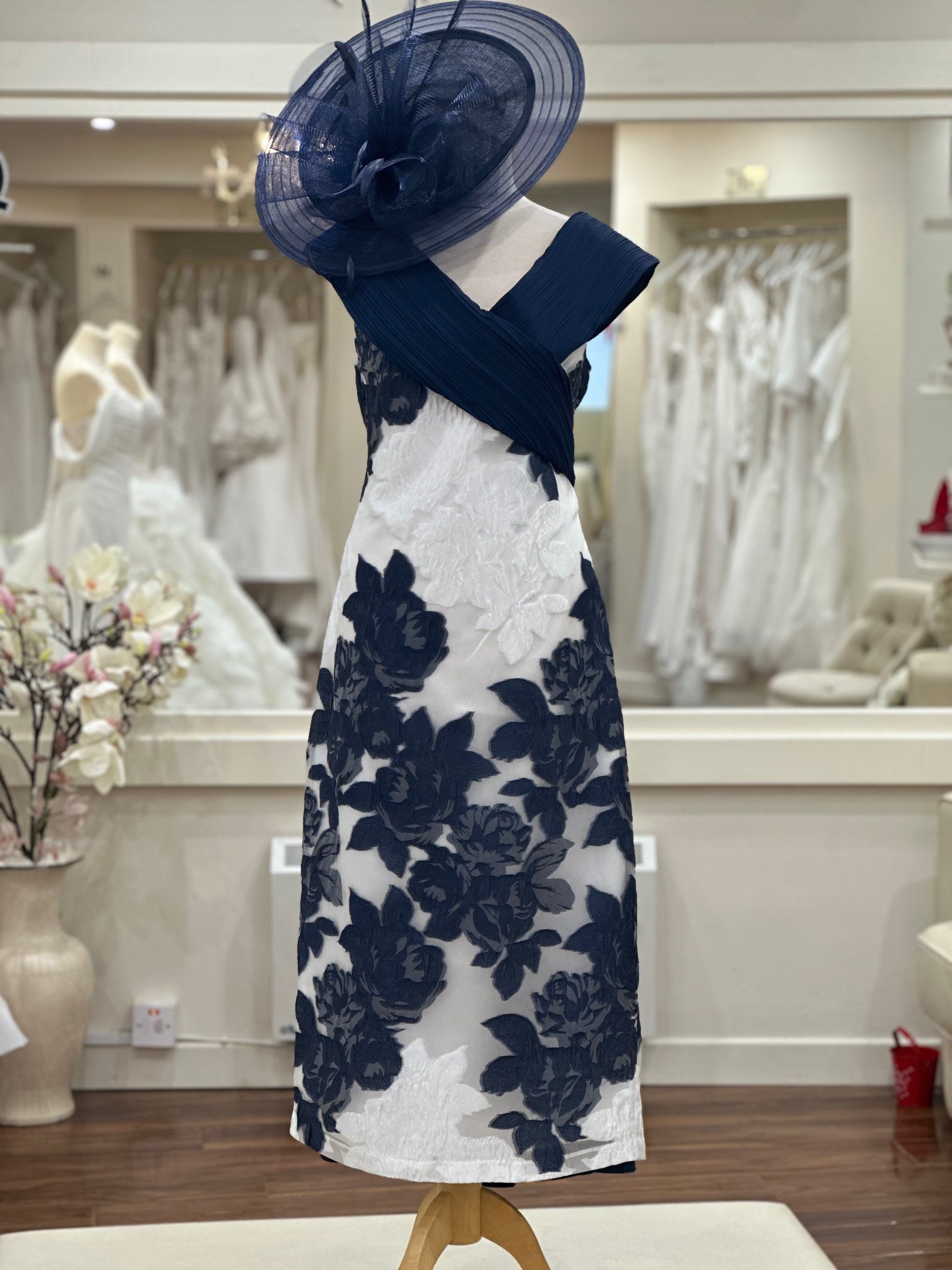Classic sophistication meets modern design in this beautifully structured navy and ivory occasion dress.