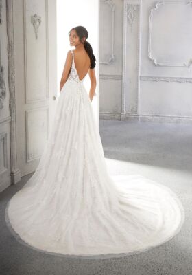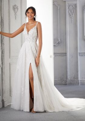 Home / Wedding Dresses / Morilee Wedding Dresses / Main Collection Wedding Dresses / 2363 Clementina Wedding DressA twist on traditional bridal, Clementina is a flowing sequined, Chantilly lace A-line with trendy elements. The delicately embroidered bodice is covered in clear and crystal beading for a pop of shimmer, and embroidered straps lead to an exposed v-shaped back. Covered buttons and a dainty bow belt keep the gown traditional, while the front skirt slit gives an edge to the gorgeous gown.