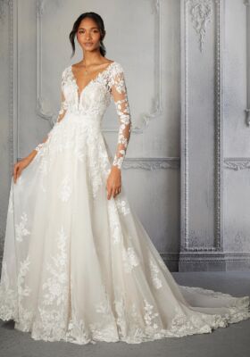 Home / Wedding Dresses / Morilee Wedding Dresses / Main Collection Wedding Dresses / 2372 Chelsea Wedding DressOur Chelsea designer wedding dress is a classic in the making with gorgeous beaded, frosted embroidered appliqués decorating the gown from its sheer long sleeves to scalloped hemline. The soft v-neckline matches the open v-shaped back, while detachable, draped fabric cinches in the waist to create a stunning silhouette. And we didn’t forget the sparkle with the glitter net ball gown skirt