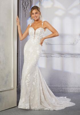 Home / Wedding Dresses / Morilee Wedding Dresses / Main Collection Wedding Dresses / 2379 Camille Wedding DressOur Camille designer wedding dress is full of superior style and elegant details. The romantic sweetheart bodice features and slim, sheer plunging detail and is adorned in sparkling crystal beaded, embroidered lace appliqués. The sultry fit and flare silhouette stuns in delicate frosted Chantilly lace and features a sheer, petal train