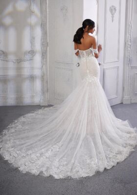 Home / Wedding Dresses / Morilee Wedding Dresses / Main Collection Wedding Dresses / 2386 Circe Wedding DressOur Circe designer wedding dress is an absolute moment with its dramatic mermaid silhouette and glamourous details. A flurry of frosted, embroidered floral appliqués decorate the gown from sweetheart bodice to the wide hemline border. We certainly didn’t forget the sparkle, with crystal beaded neckline trim and shimmering sequined Chantilly lace. Detachable off-the-shoulder sleeves and a stunning sheer train finish off the mesmerizing dress.