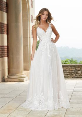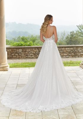 Home / Wedding Dresses / Morilee Wedding Dresses / Main Collection Wedding Dresses / 2404 Dina Wedding DressClassically romantic with decadent details, our Dina wedding dress has it all. The elegant A-line features a lovely v-neck bodice designed with beautiful, embroidered lace appliqués on gossamer-like tulle over sparkle organza for a dazzling effect. The back is absolutely breathtaking with crystal beaded straps, giving you an extra dose of bridal sparkle and a textured godet skirt that leads to a chapel length train and scalloped hemline.