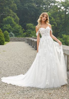 Home / Wedding Dresses / Morilee Wedding Dresses / Main Collection Wedding Dresses / 2406 Divina Wedding DressDesigned with divine inspiration, our Divina designer wedding dress is a dream. The soft A-line ball gown features an expertly crafted bustier bodice with a strapless sweetheart neckline accented by crystal beaded, 3-D floral appliqués. Patterned sequin tulle gives the gown a dimensional sparkle, and with the detachable off-the-shoulder sleeves, it’s the definition of whimsical romance.