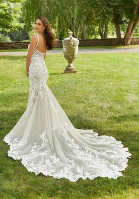 Home / Wedding Dresses / Morilee Wedding Dresses / Main Collection Wedding Dresses / 2421 Dana Wedding DressOur Dana wedding dress is cool and classy with a soft scoop neckline and Chantilly lace bodice on a gorgeous tulle mermaid. Blingy crystal beading lines the straps and sheer back detailing, giving the gown a sultry edge. Embroidered appliqués are artfully placed to accentuate the dress and create a stunning hemline border on the sheer, scalloped train