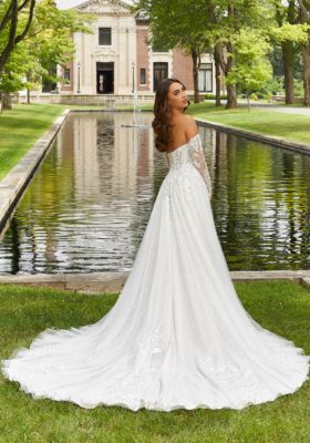 Home / Wedding Dresses / Morilee Wedding Dresses / Main Collection Wedding Dresses / 2425 Dominique Wedding DressDominique is an absolutely enchanting gown, taking a classic design and adding couture details. The stunning sheer bodice features amazing corsetry, with a plunging moment and romantic sweetheart neckline. Soft tulle over sparkle net creates an ethereal effect on this bold ball gown, and with decadent crystal beaded, embroidered appliqués this dress is both intriguing and glamorous. Pair the gown with detachable gauntlet sleeves to take the look to the next level.