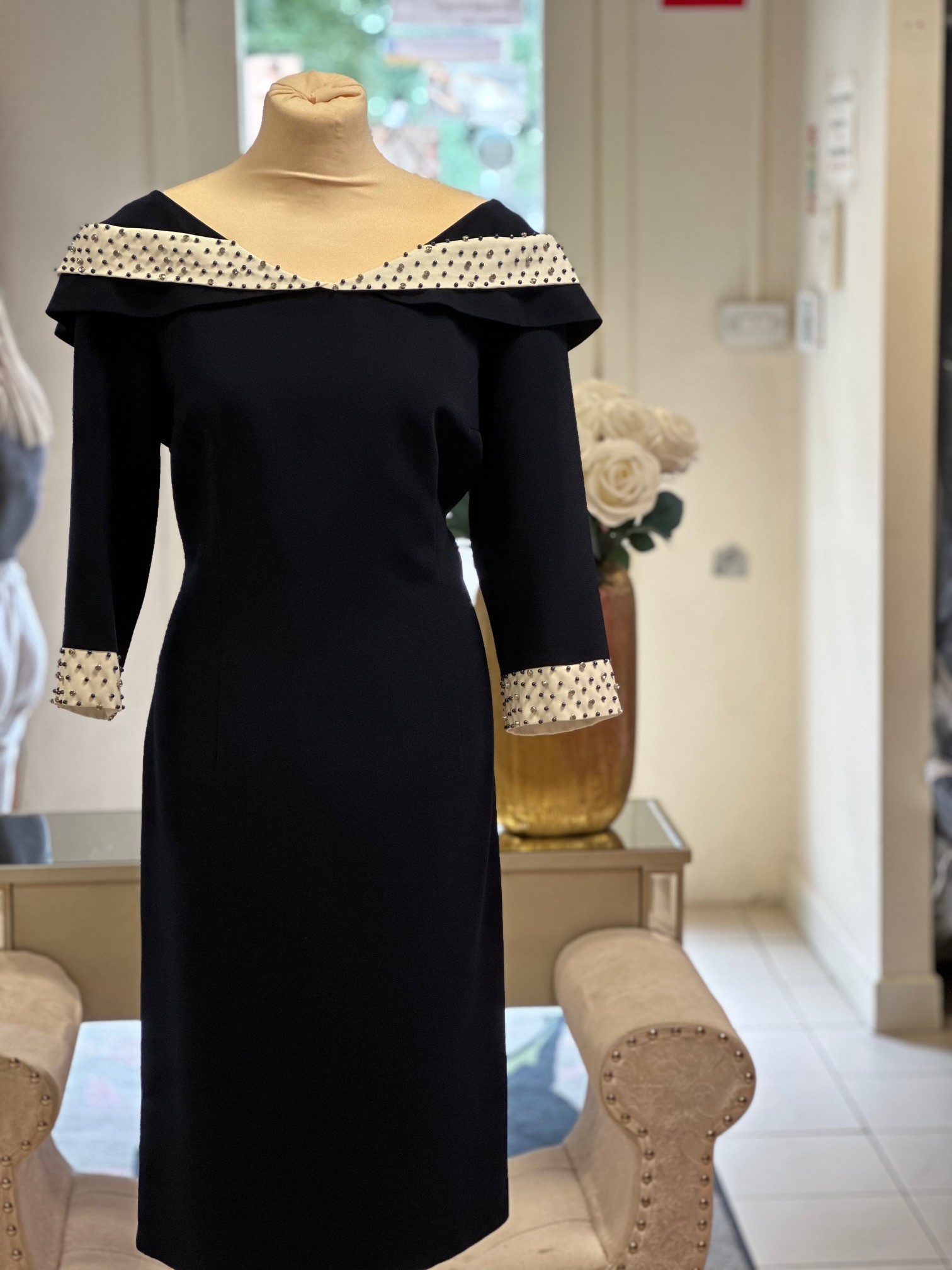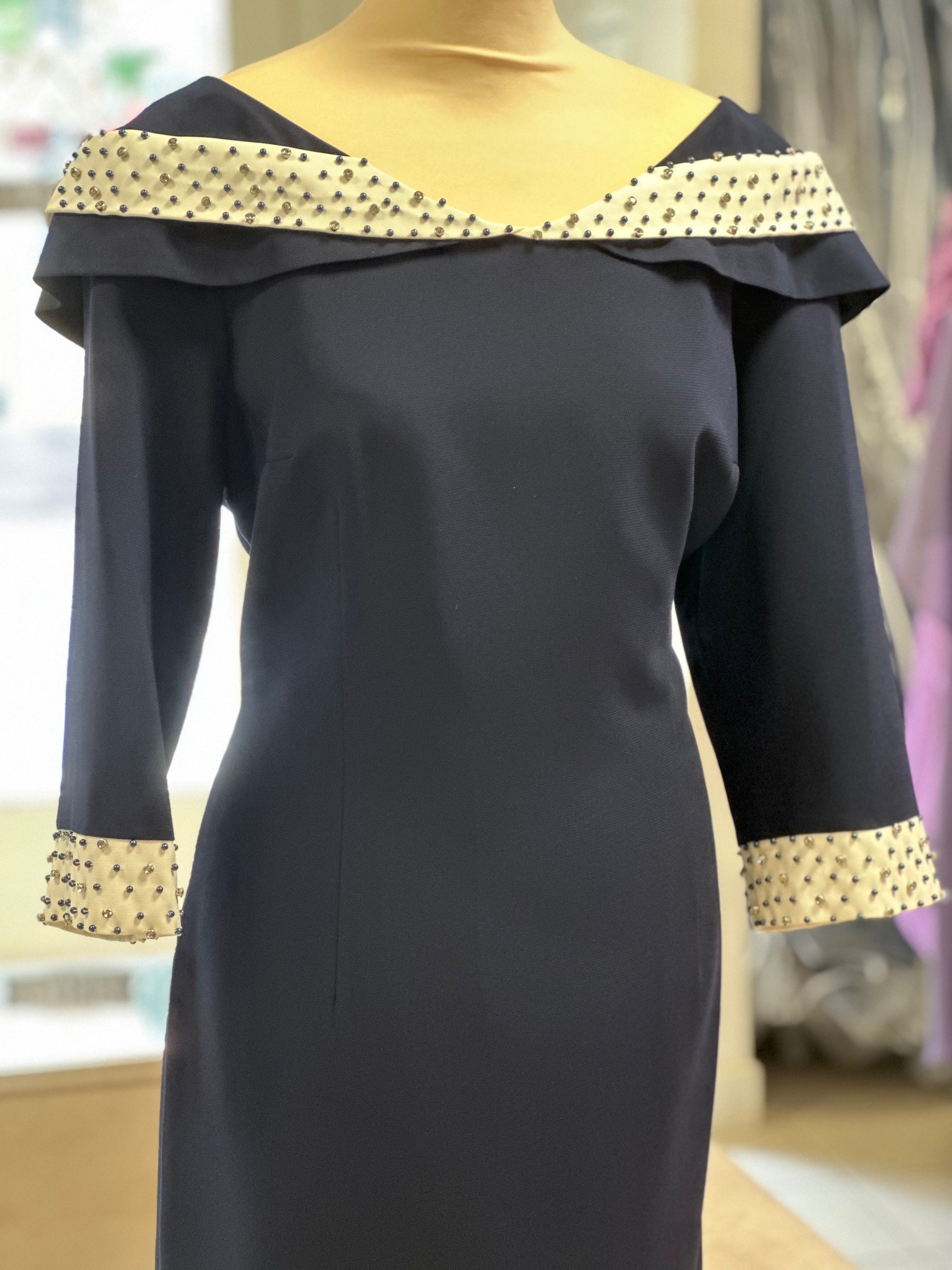 Home / Occasion Wear / Guest Wear for weddings or special occasions / 2599 - Navy Dress with Ivory CollarA navy shift dress with an ivory collar and beading sounds like a stylish and elegant choice for a wedding guest. The combination of navy and ivory is classic and sophisticated, and the beading adds a touch of glamour and sparkle.