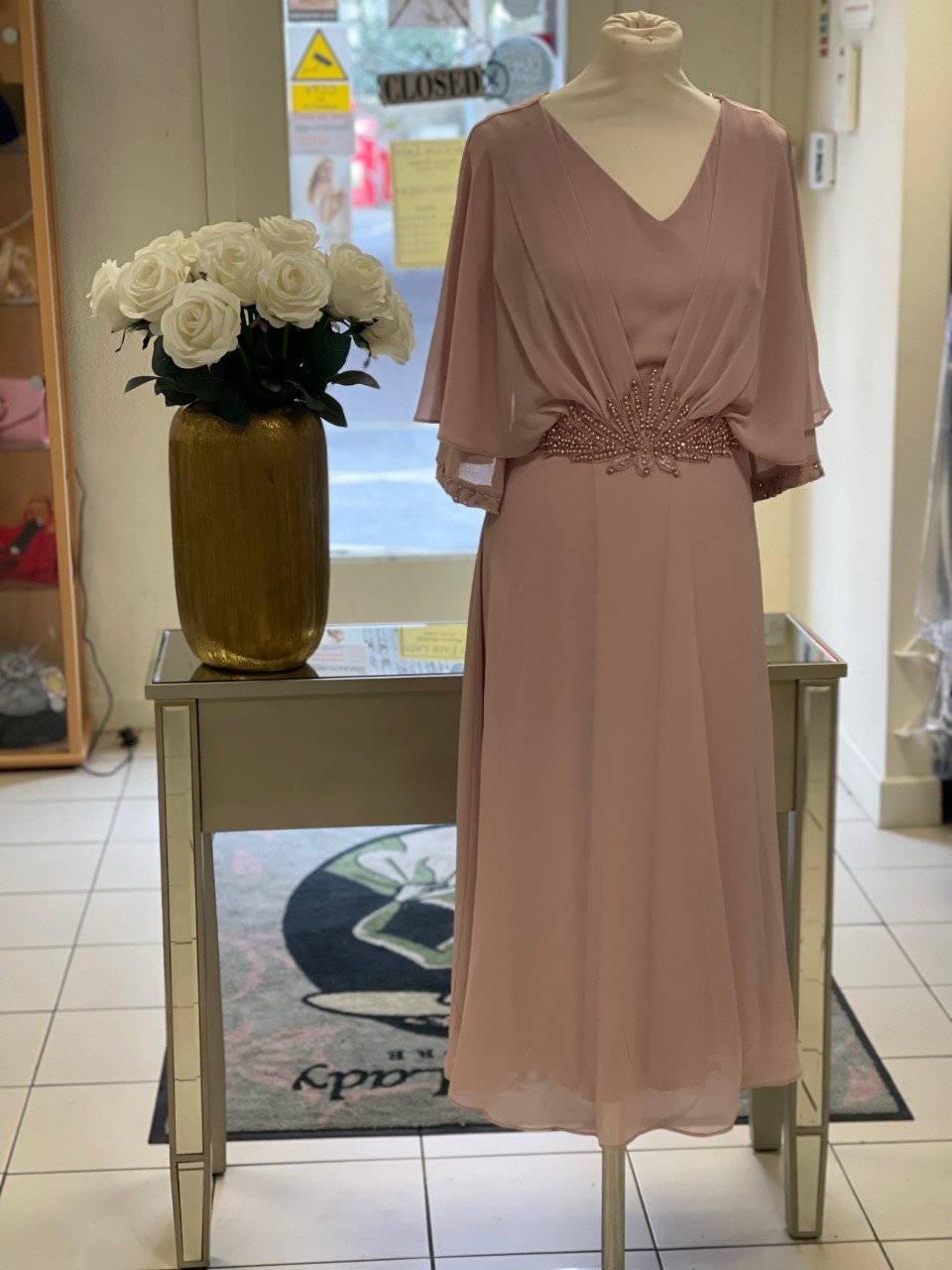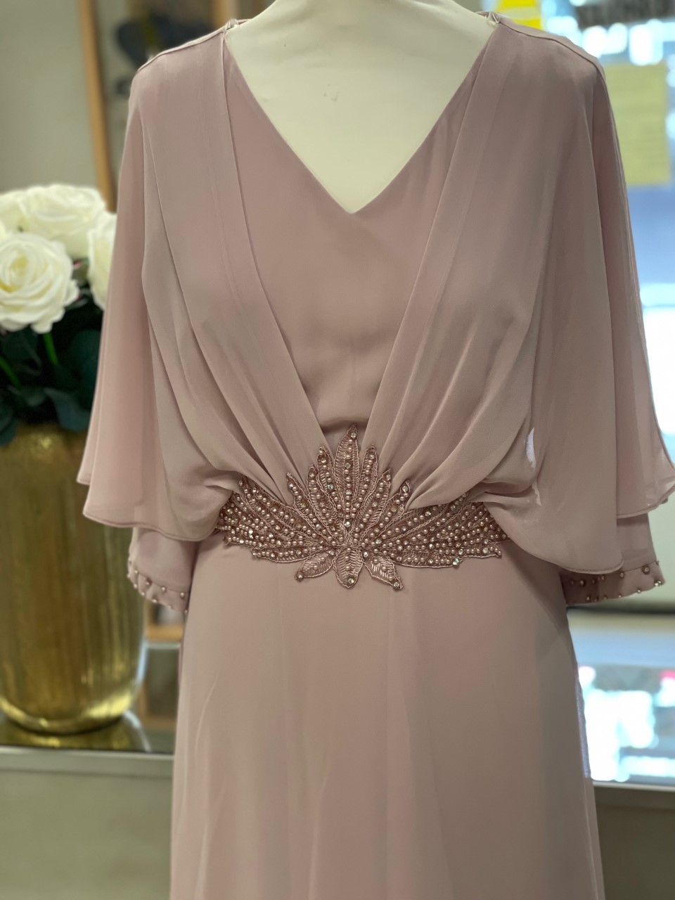 This is a classic mother of the bride or groom dress, the beading on the middle draws the eye in to the waist while the sleeves and the cape effect cover all the back and shoulder areas.  An A line skirt swings beautifully
