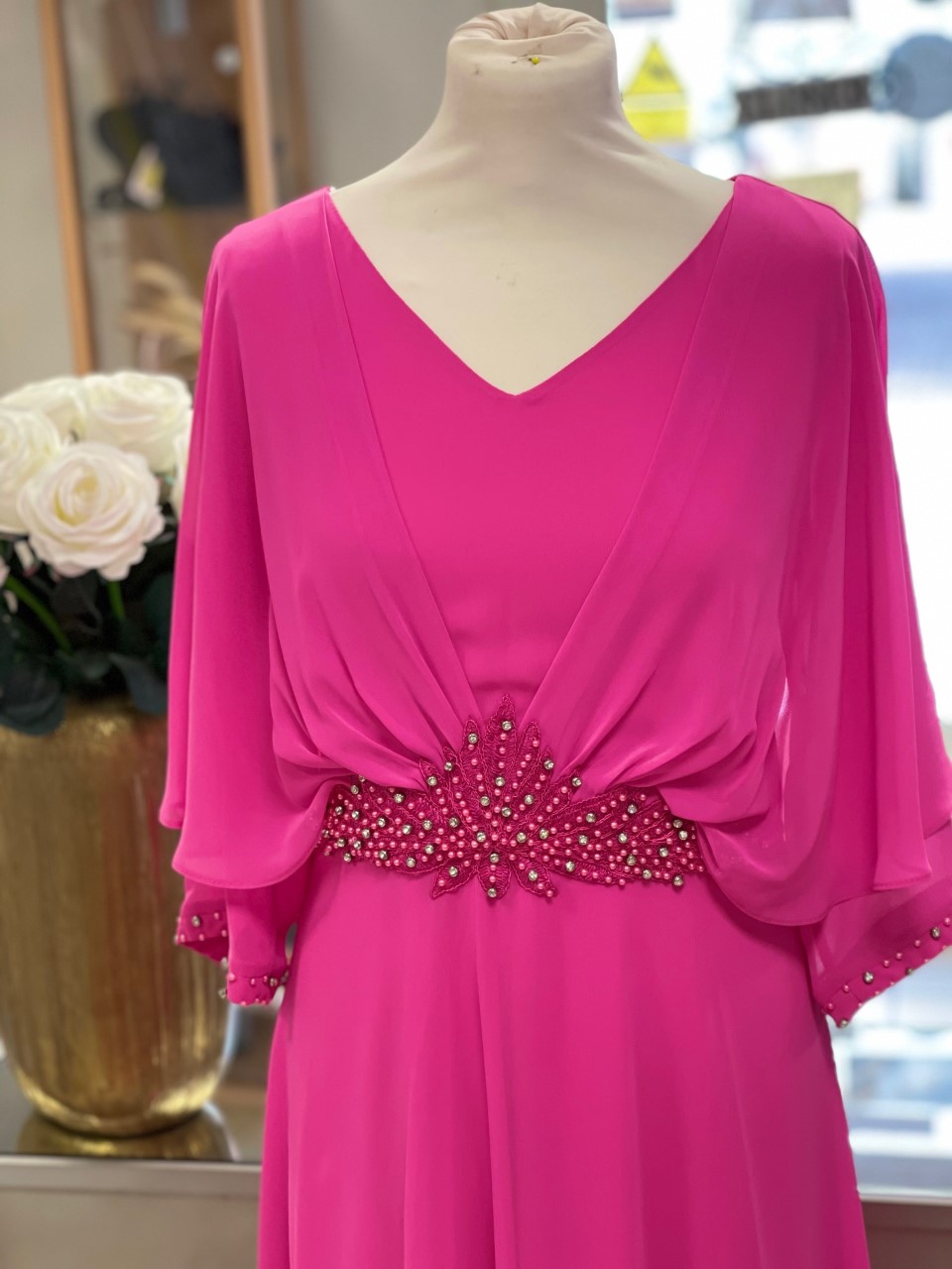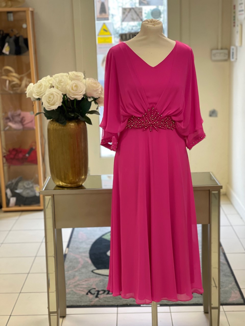 This is a classic mother of the bride or groom dress, the beading on the middle draws the eye in to the waist while the sleeves and the cape effect cover all the back and shoulder areas. An A line skirt swings beautifully