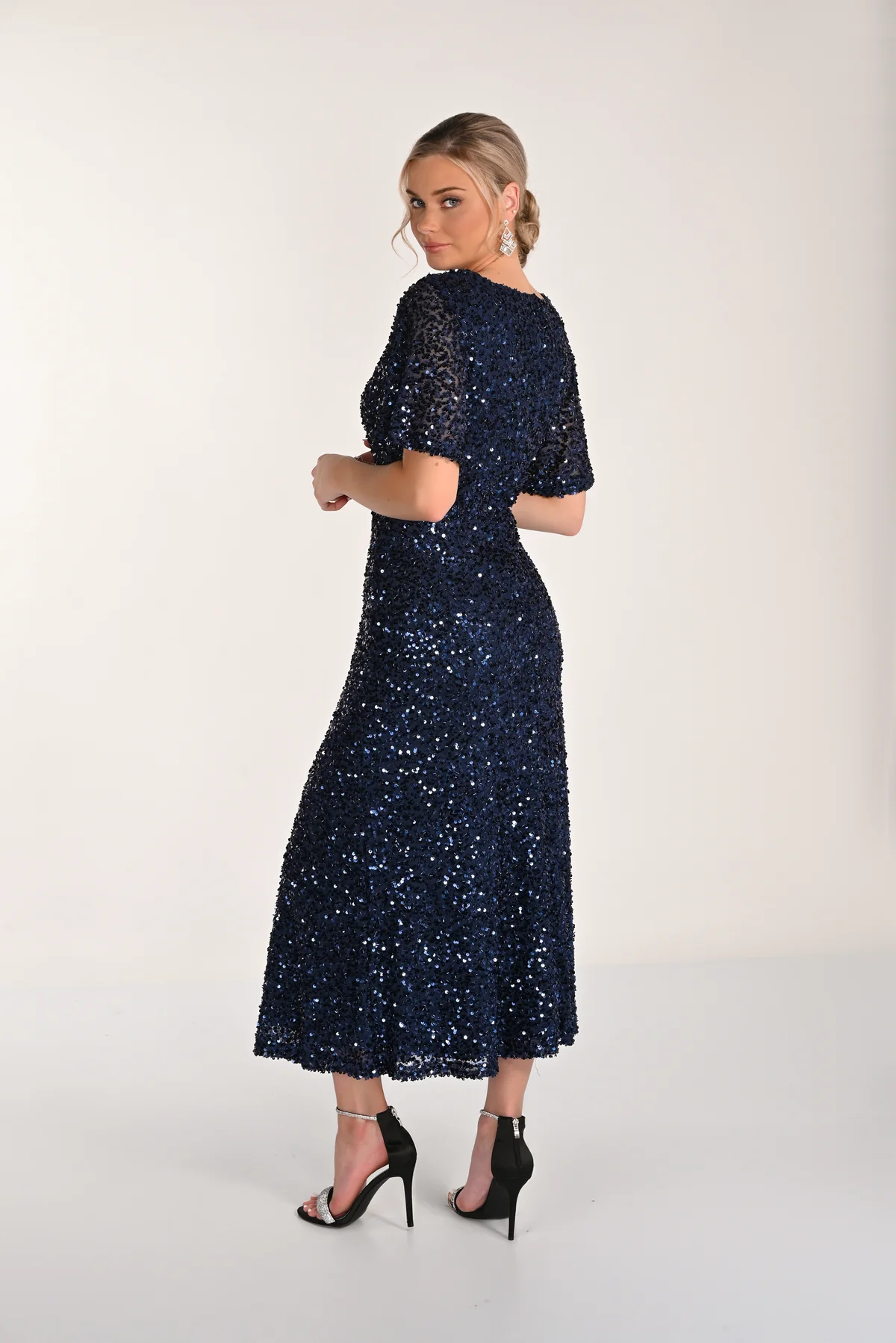 A stunning navy sequin midi dress designed to shimmer beautifully with every step. Crafted in an all-over deep midnight sequin, it catches the light in the most elegant, sophisticated way —