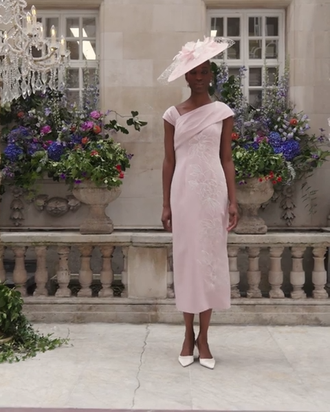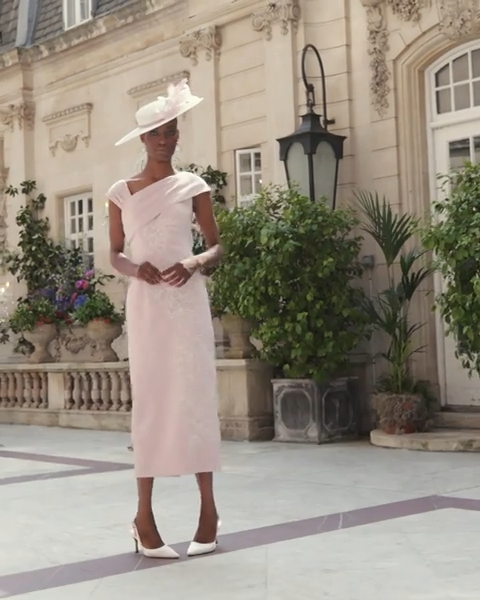 Intricate tonal embroidery adds subtle texture and depth through the skirt, elevating the design with a touch of artistry while maintaining its understated charm. The midi length keeps it polished and occasion-ready — perfect for weddings, race days, or a chic mother of the bride/groom look.