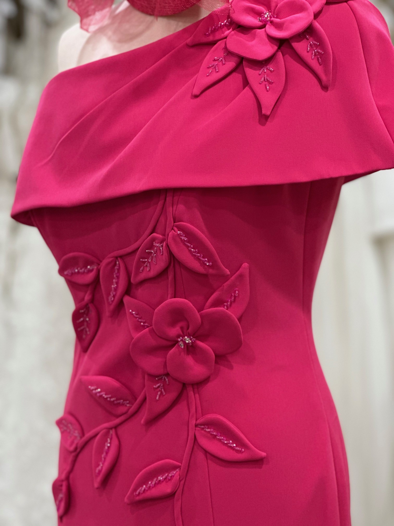 Intricate floral appliqué cascades gracefully from the bodice down the skirt, adding texture, dimension, and a couture-inspired finish.