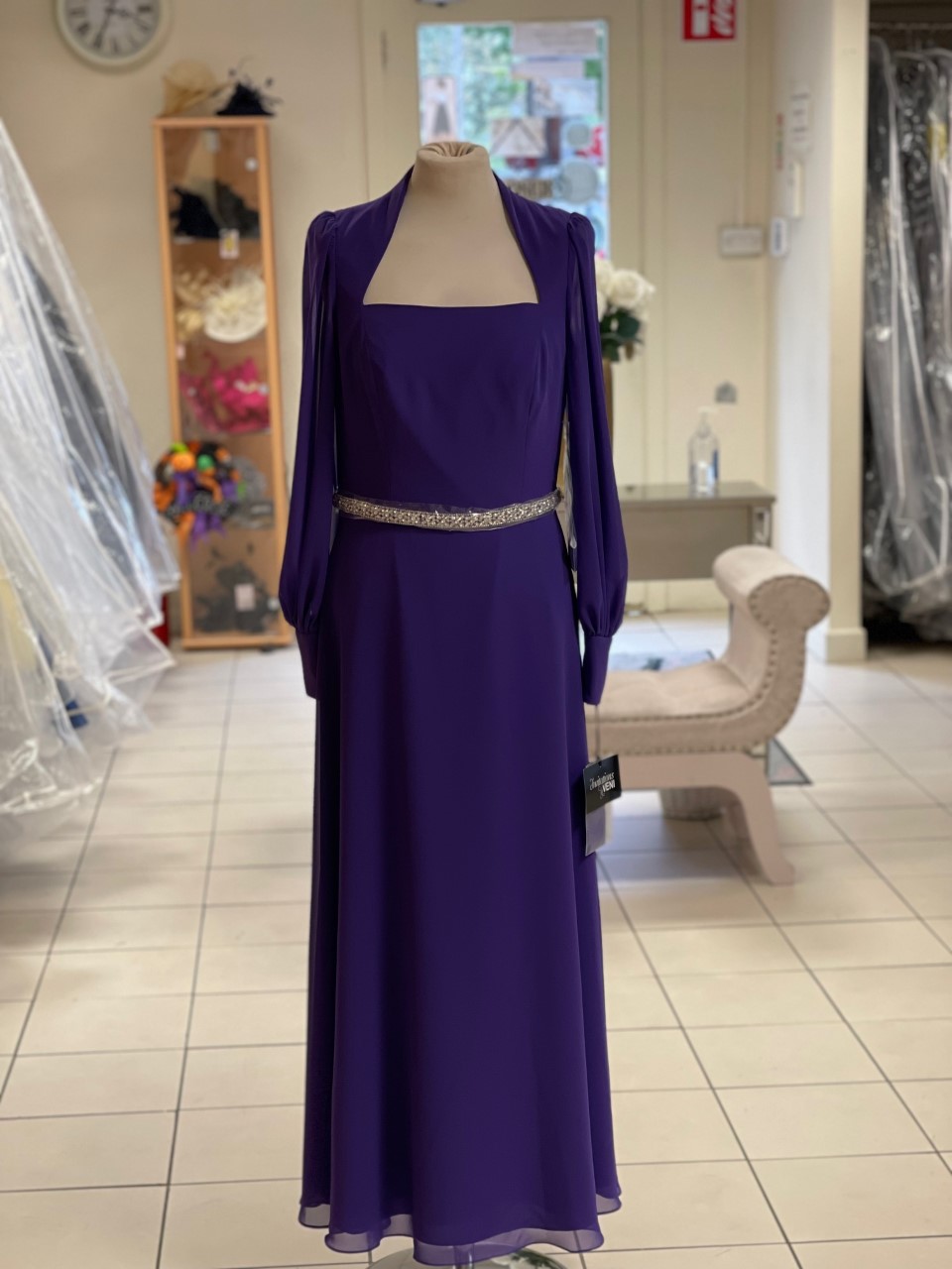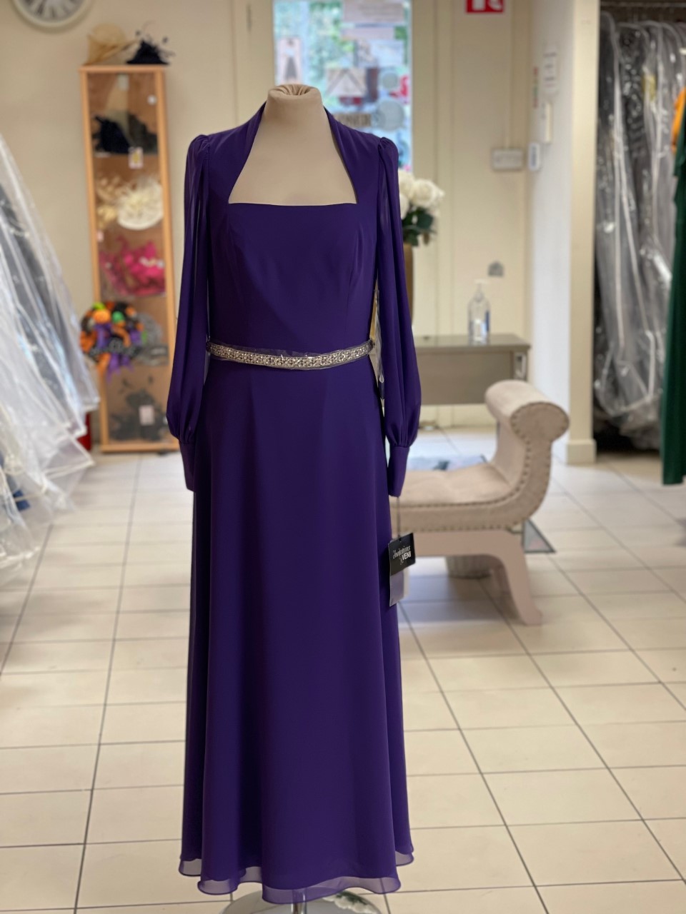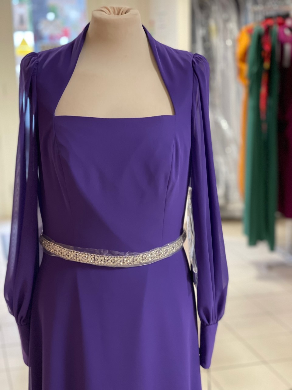 A simplistic elegant A-line dress the puffed sleeves and square neckline. Detailed with a beaded elegant belt. Perfect for the most sophisticated of mothers.