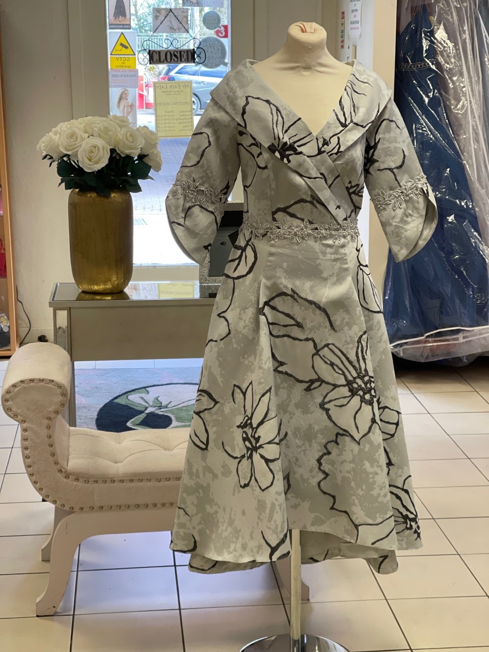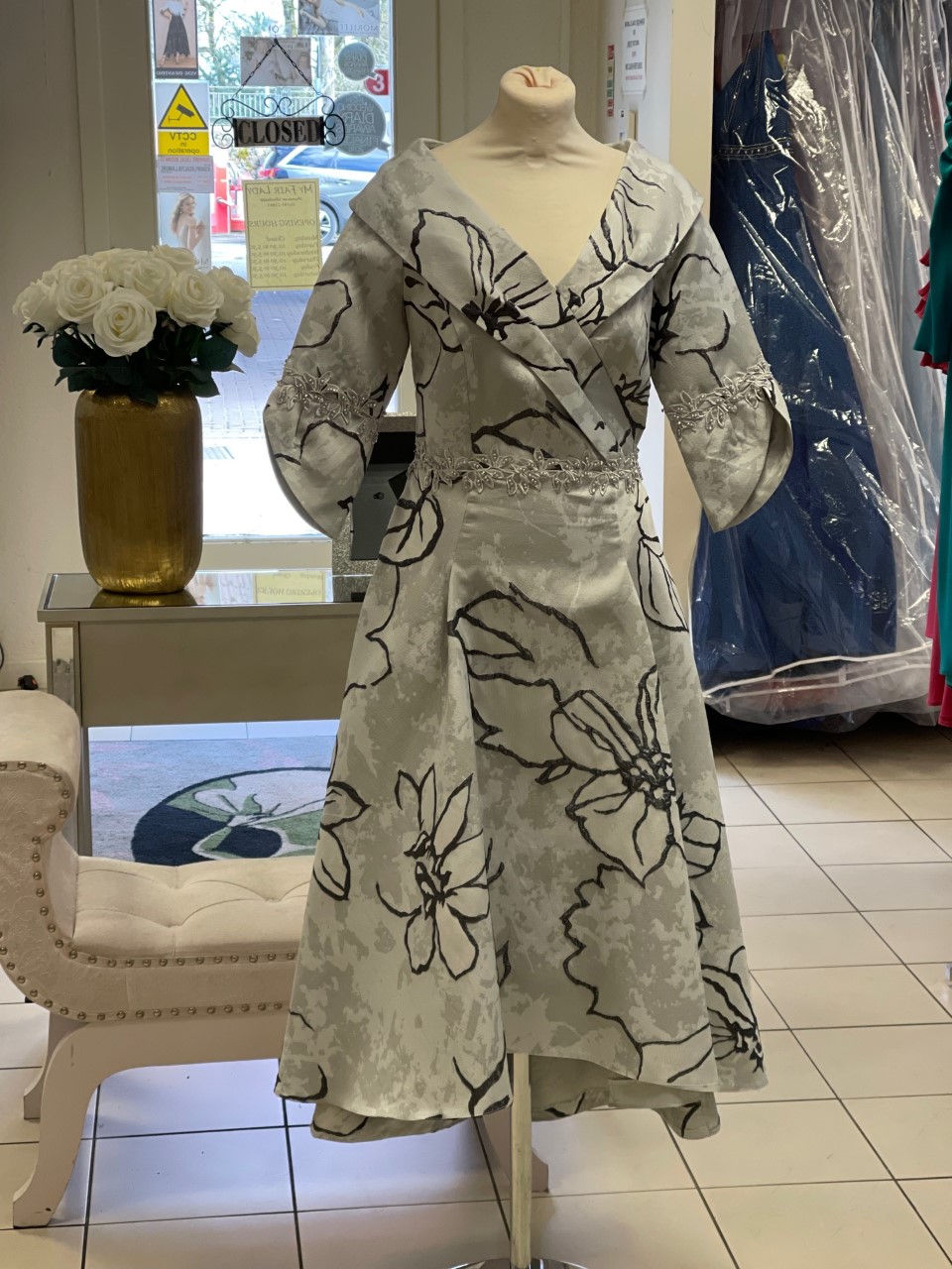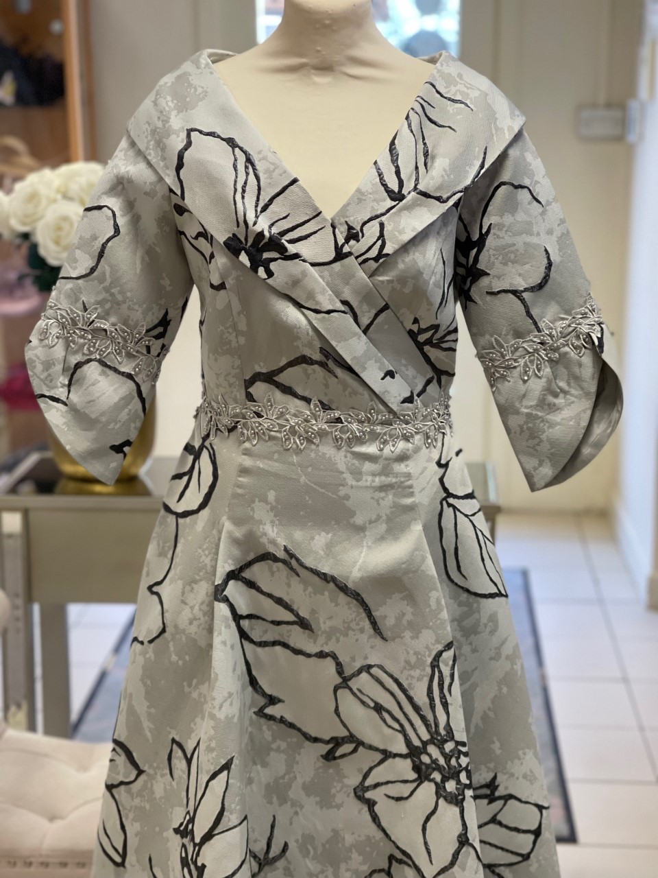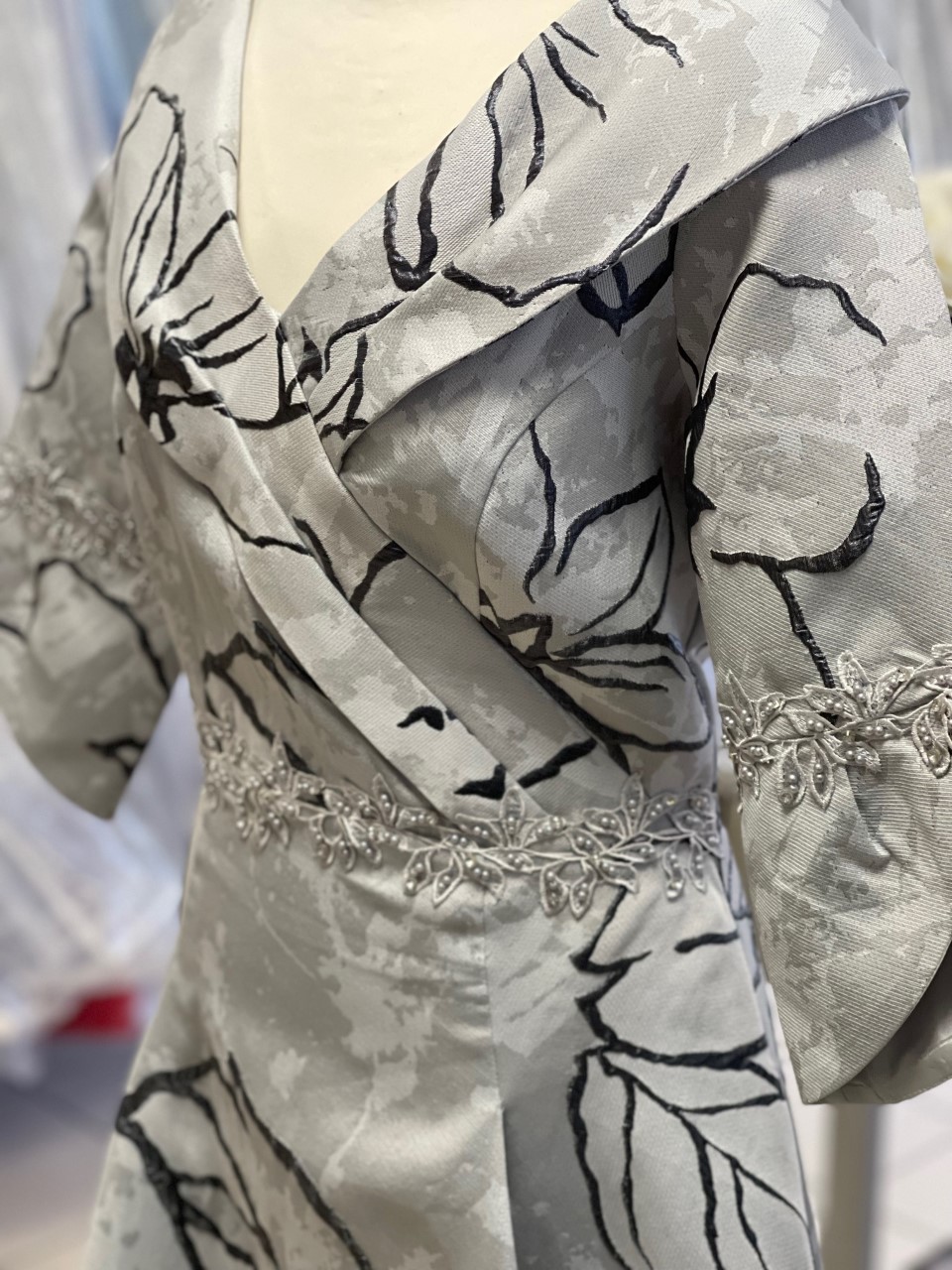 This Bella Premium dress is absolutely stunning! The silver grey brocade fabric with pearl detailing on the waist and fluttered sleeves is a unique and elegant combination that is sure to make you stand out at any event.