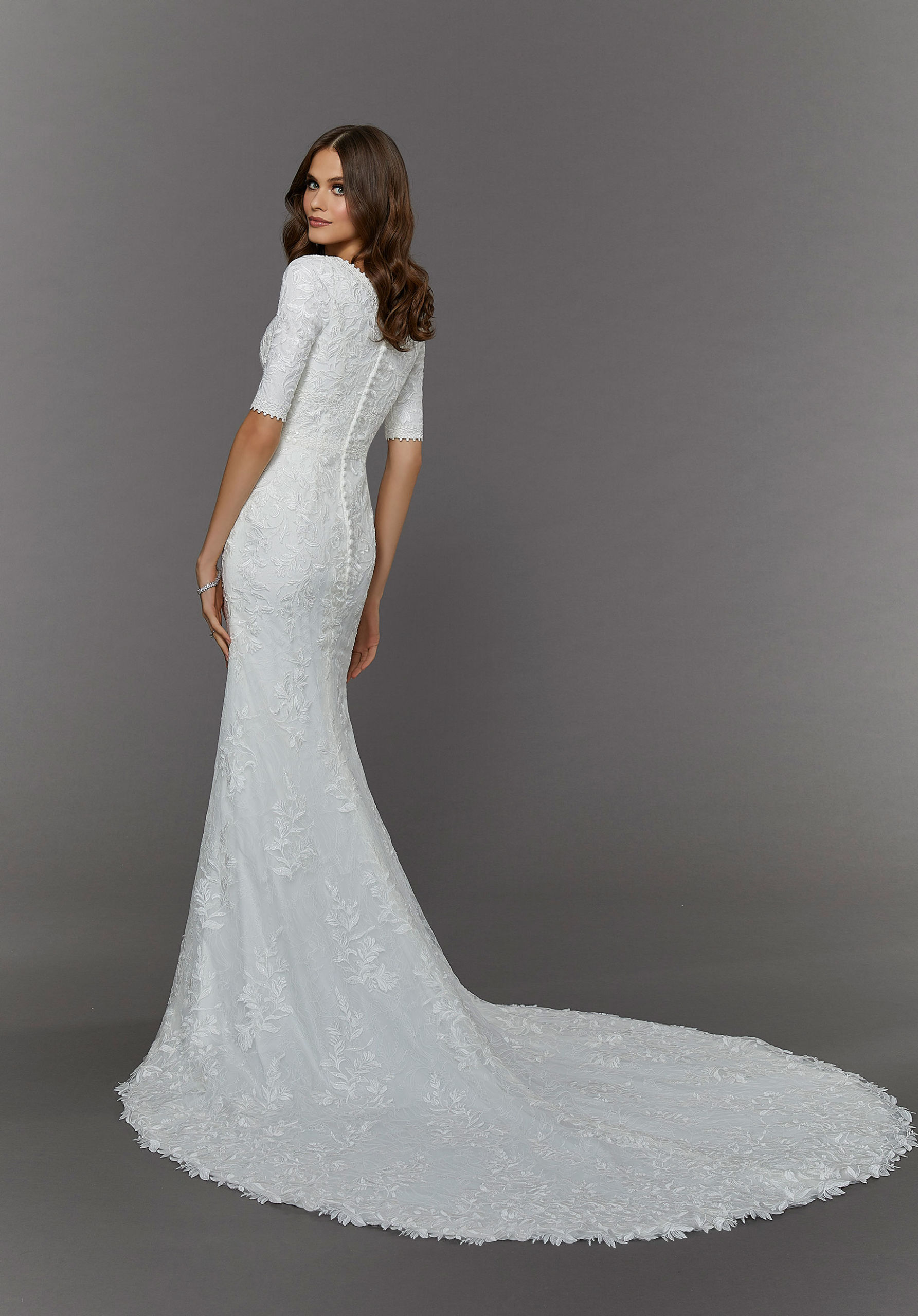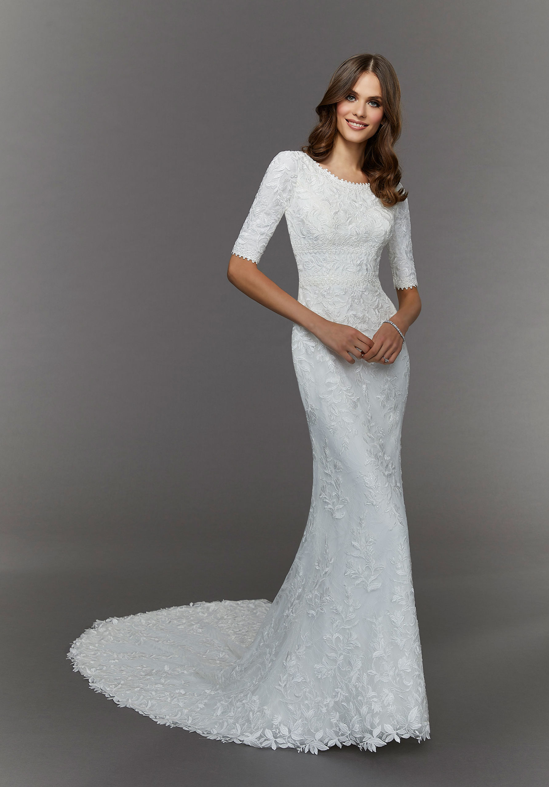 Edith is a refreshing take on vintage style. The slim sheath makes a statement with gorgeous frosted, embroidered appliqués�reminiscent of delicate climbing ivy. The scoop neckline and three-quarter sleeves have a unique, scalloped trim and beautiful embroidery at the waist helps to define your figure.