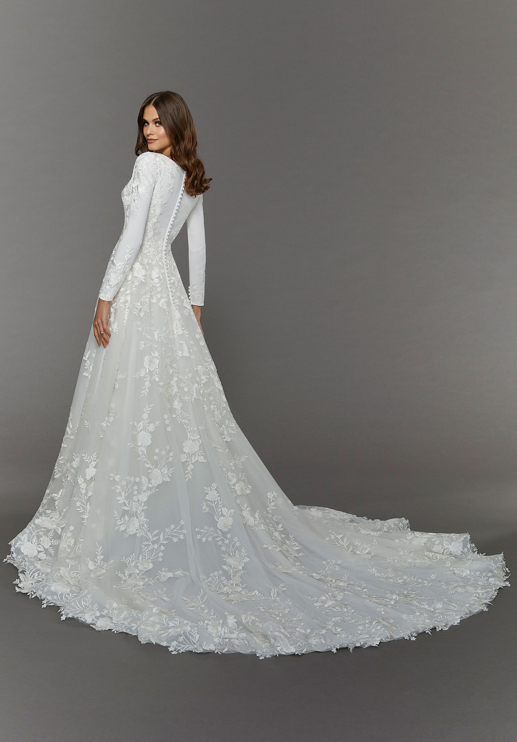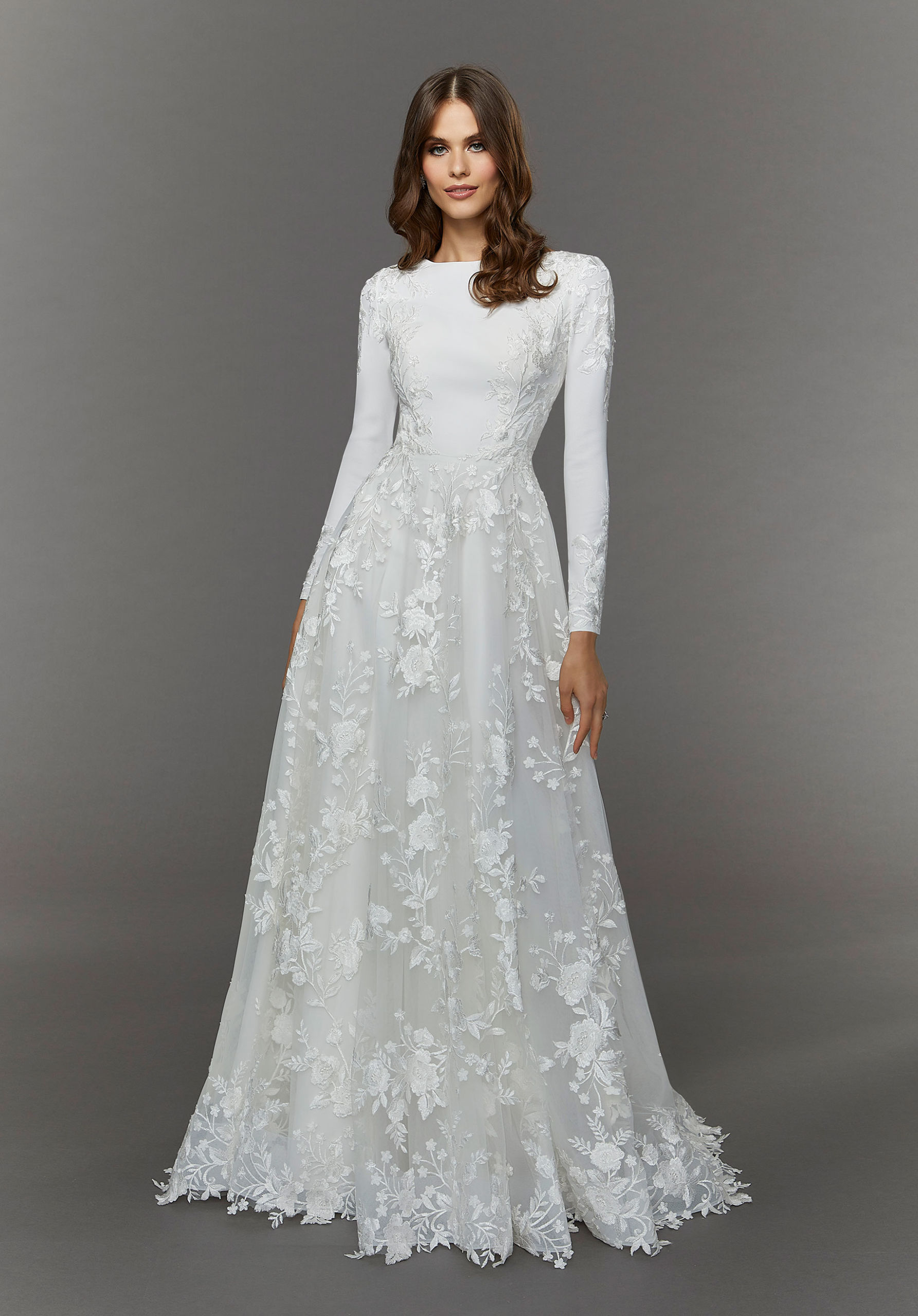 A unique combination of sleek style with a whimsical feel, our Eve wedding dress stuns with a high neck and long sleeves on a crepe bodice. Paired with a free-flowing, floral embroidered net skirt and gorgeous floral embroidered appliqués this dress is the perfect blend of classic design and modern romance.