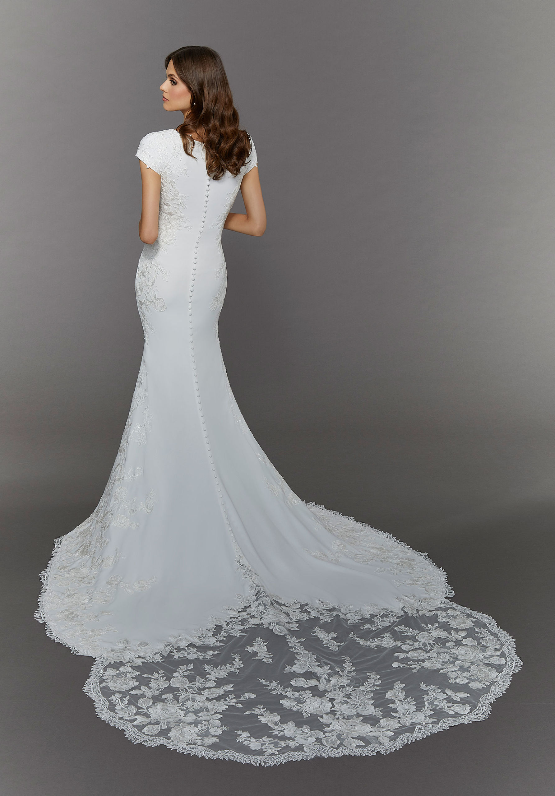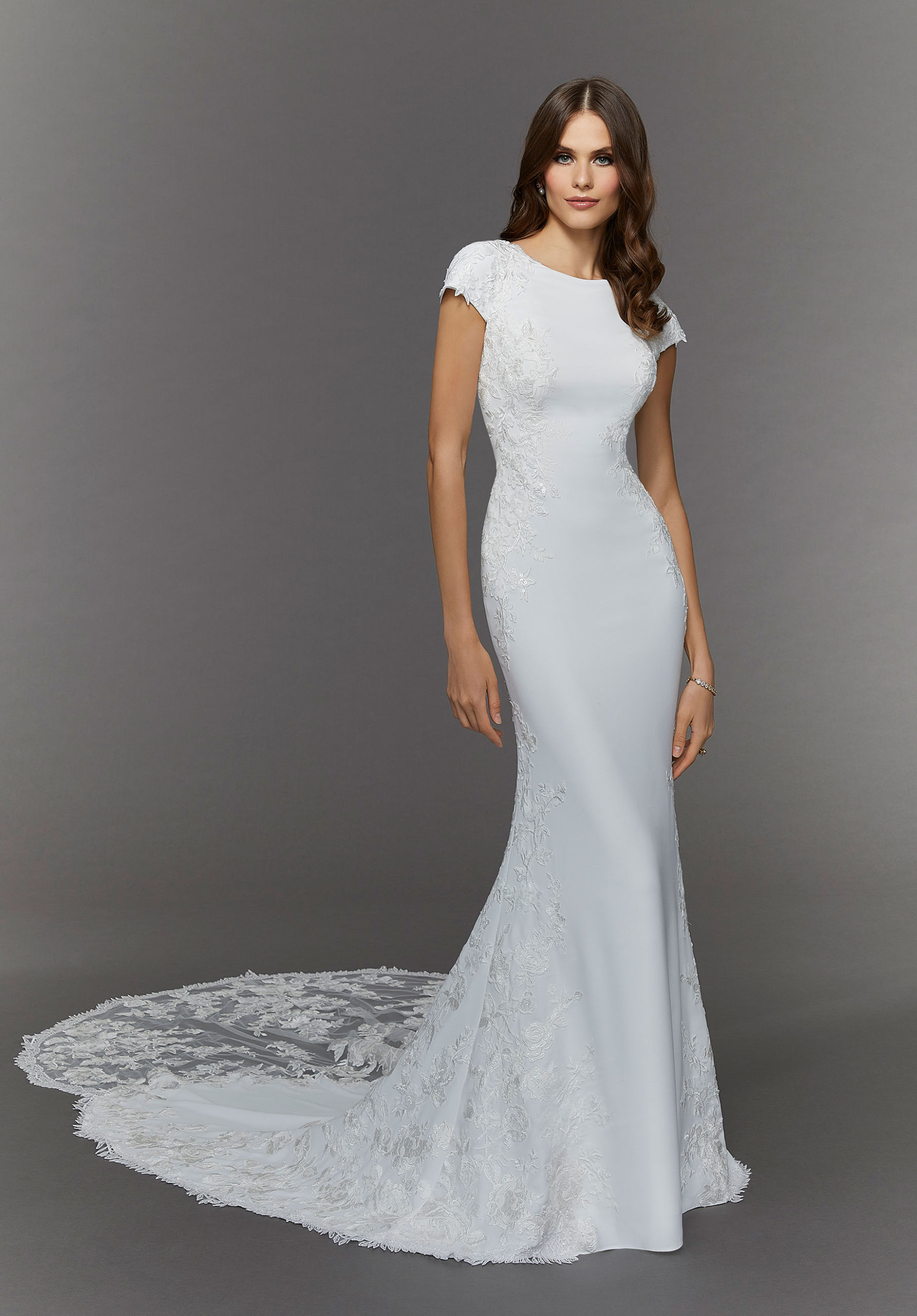Simple and alluring, our Elin wedding dress is perfect for the modest modern minimalist. Luxe crepe contours the body on a sultry fit and flare silhouette. The high neckline and short sleeves keep you looking cool and covered, while the romantic frosted, embroidered appliqués skim down the sides of the gown, emphasizing your curves. The lovely cut-away, scalloped train adds our signature touch of romance.