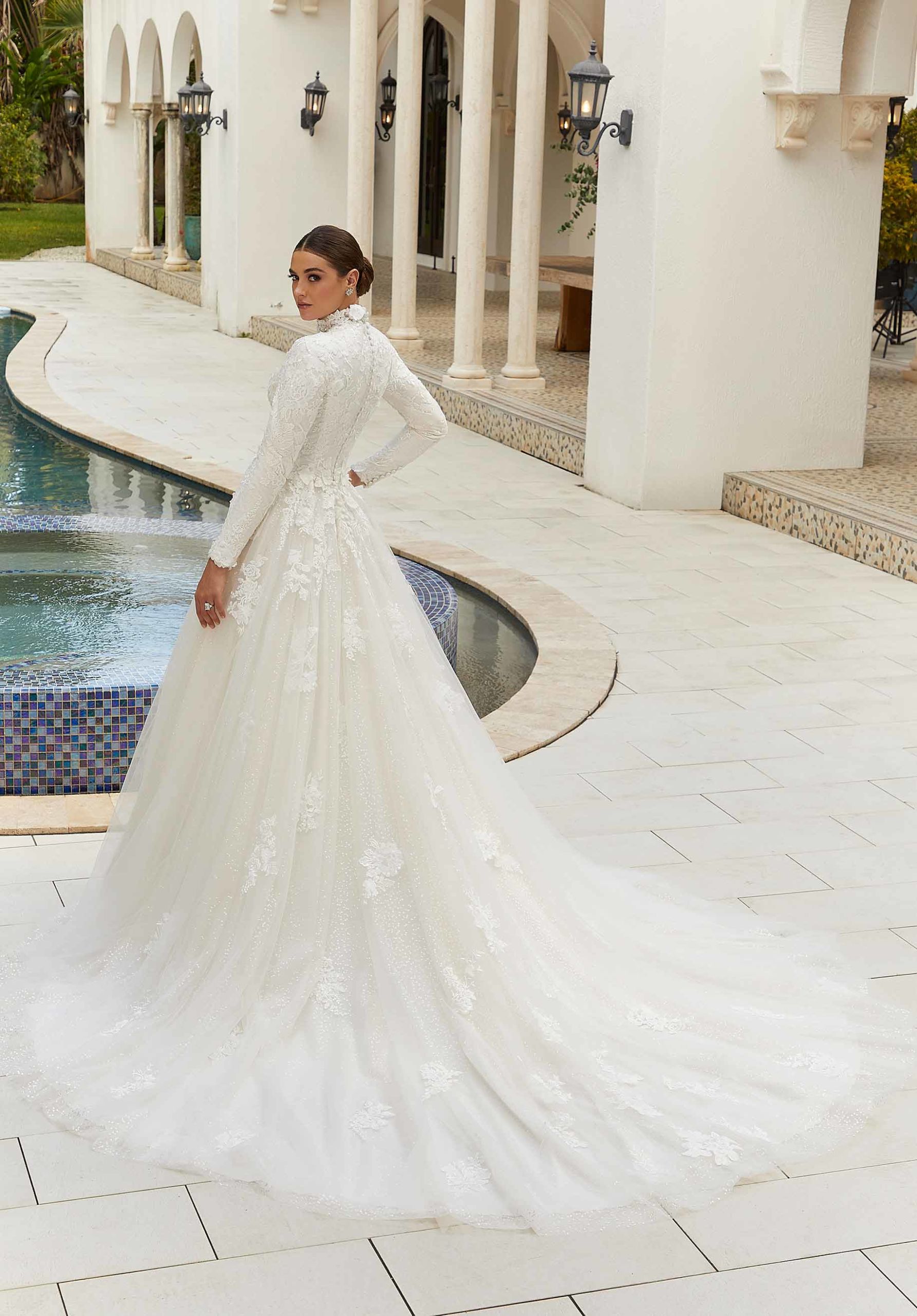 Classic ball gown has gorgeous 3D floral embroidery on a long sleeve bodice with high neckline and sheer tulle overlay over sparkling sequin net.